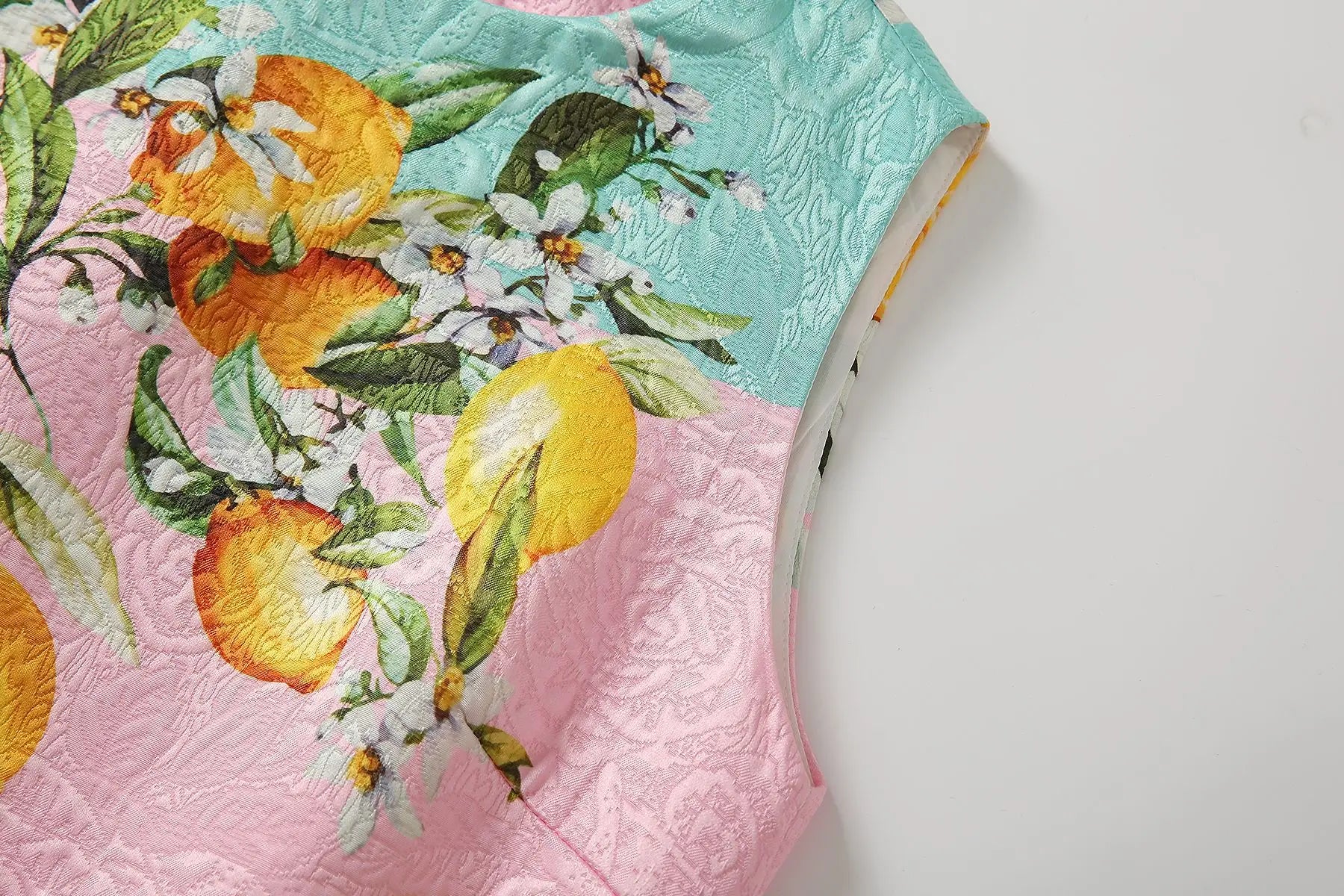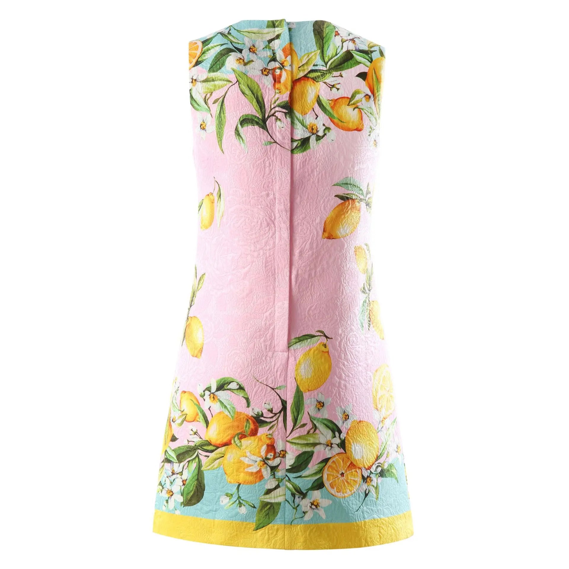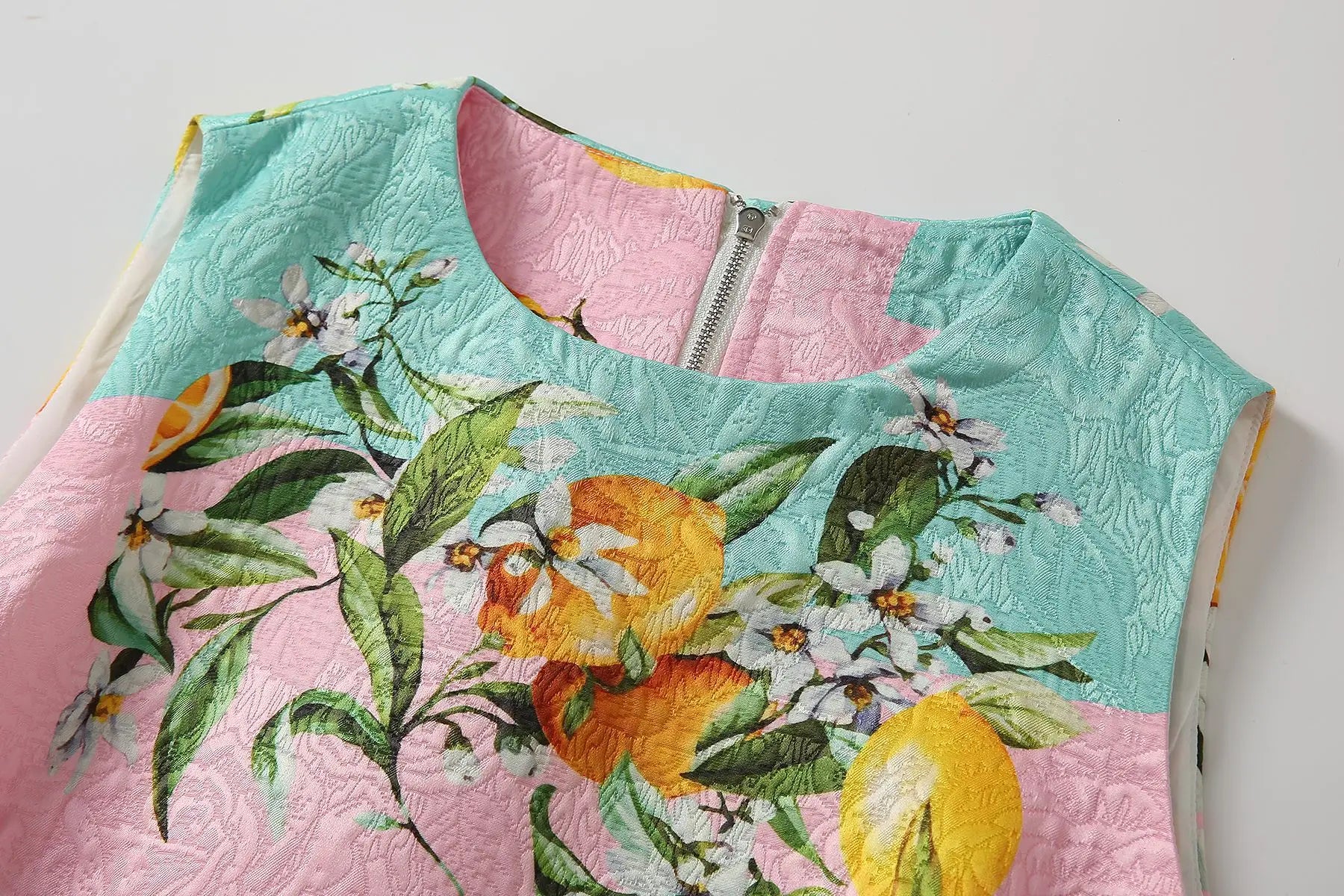 Vintage Jacquard Printed Lemon Vest A-line Dress Summer New Fashion Round Neck Sleeveless Slim Temperament Short Women's Dress