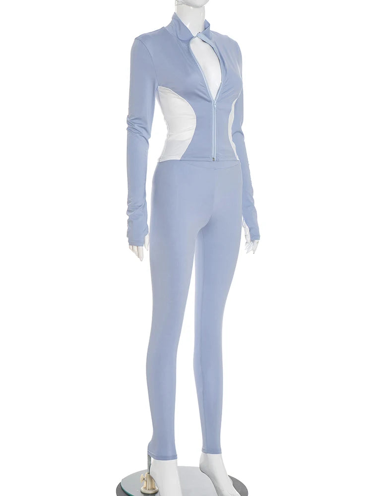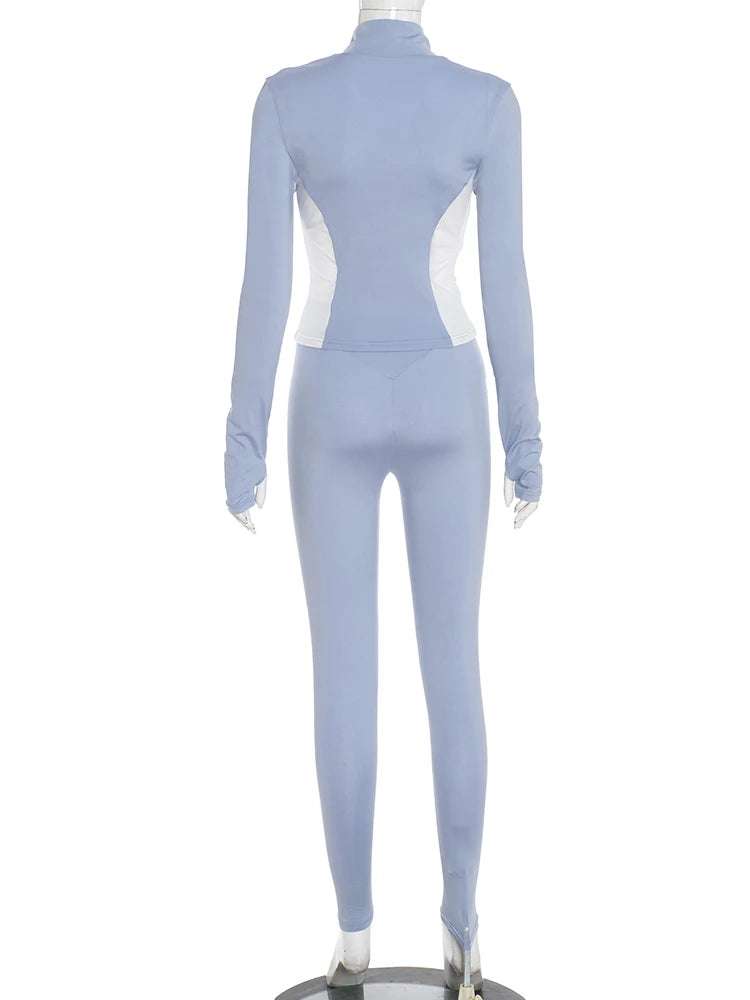 Weird Puss Contrast Patchwork 2 Piece Set Women Tracksuit Sporty Zip Full Sleeve Jacket+Skinny Leggings Daily Casual Streetwear