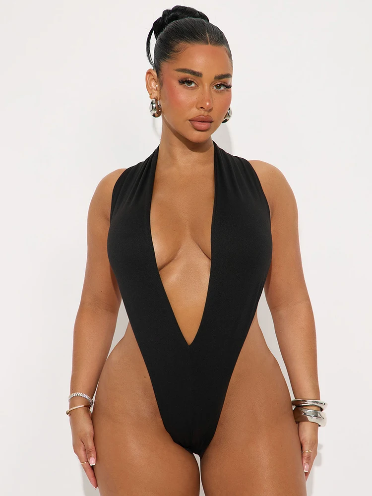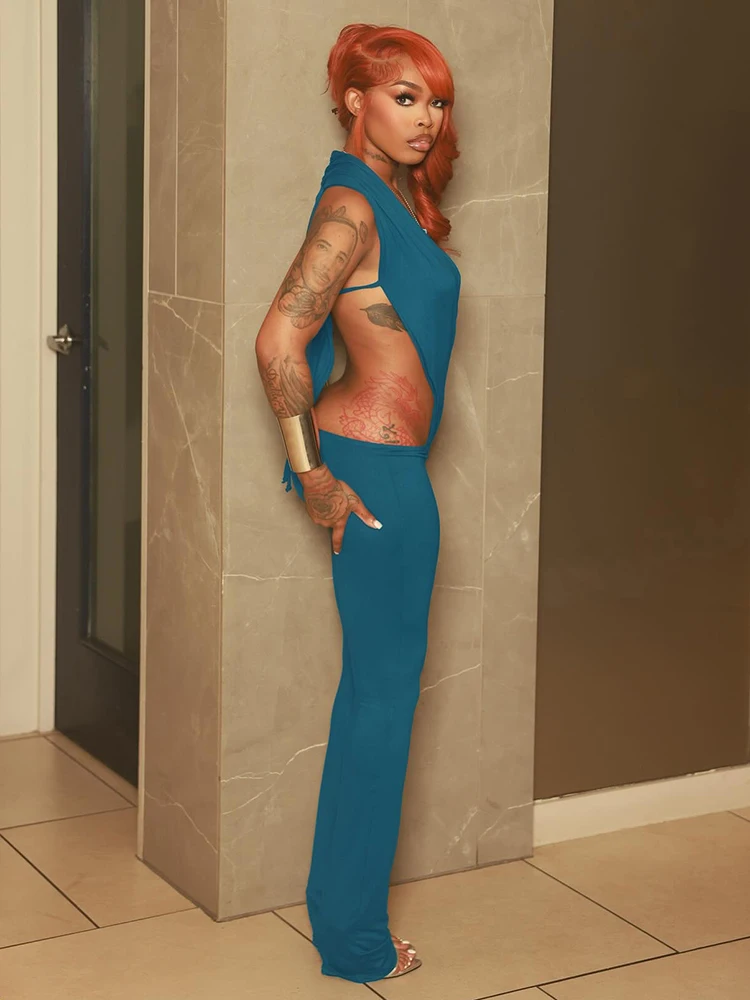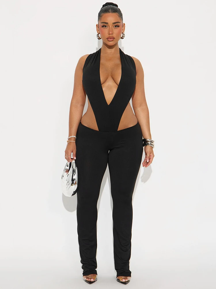 Weird Puss Hipster 2 Piece Set Women Sexy Deep V-Neck Hollow Bandage Bodysuit+Flare Pants Summer Midnight Matching Clubwear Suit