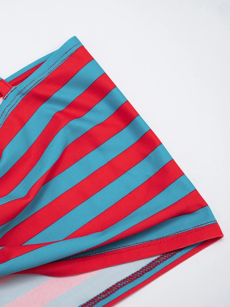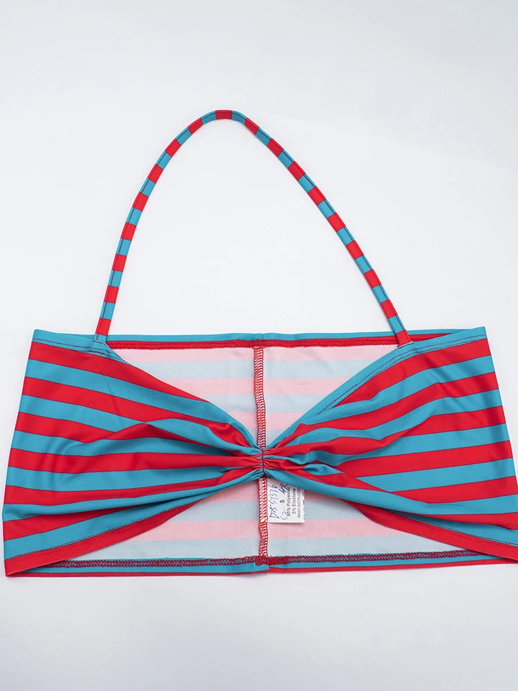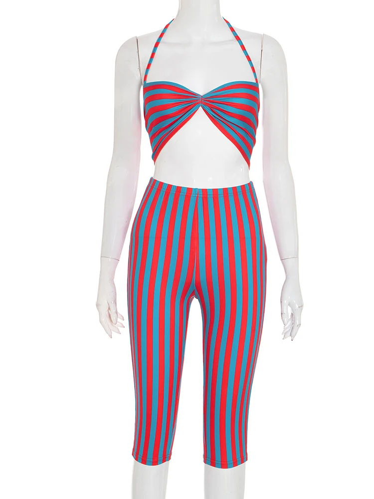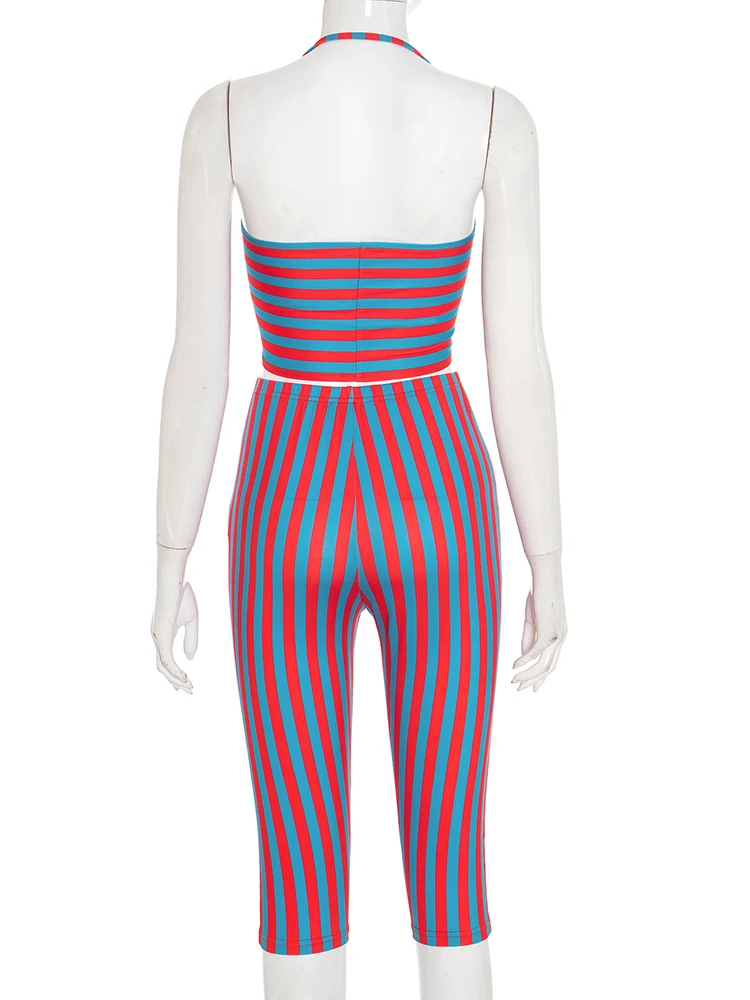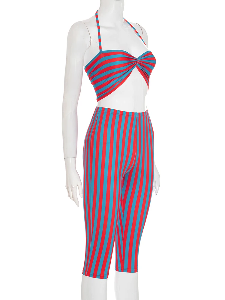 Weird Puss Sexy Stripe Patchwork 2-Piece Set Women Halter Chest Wrapped Camisole+Skinny Mid Pants Matching Hottie Beach Outfits