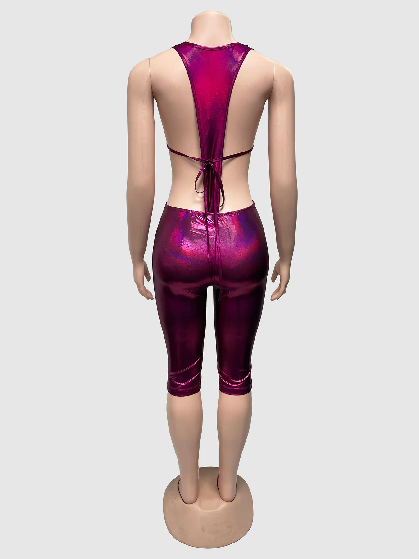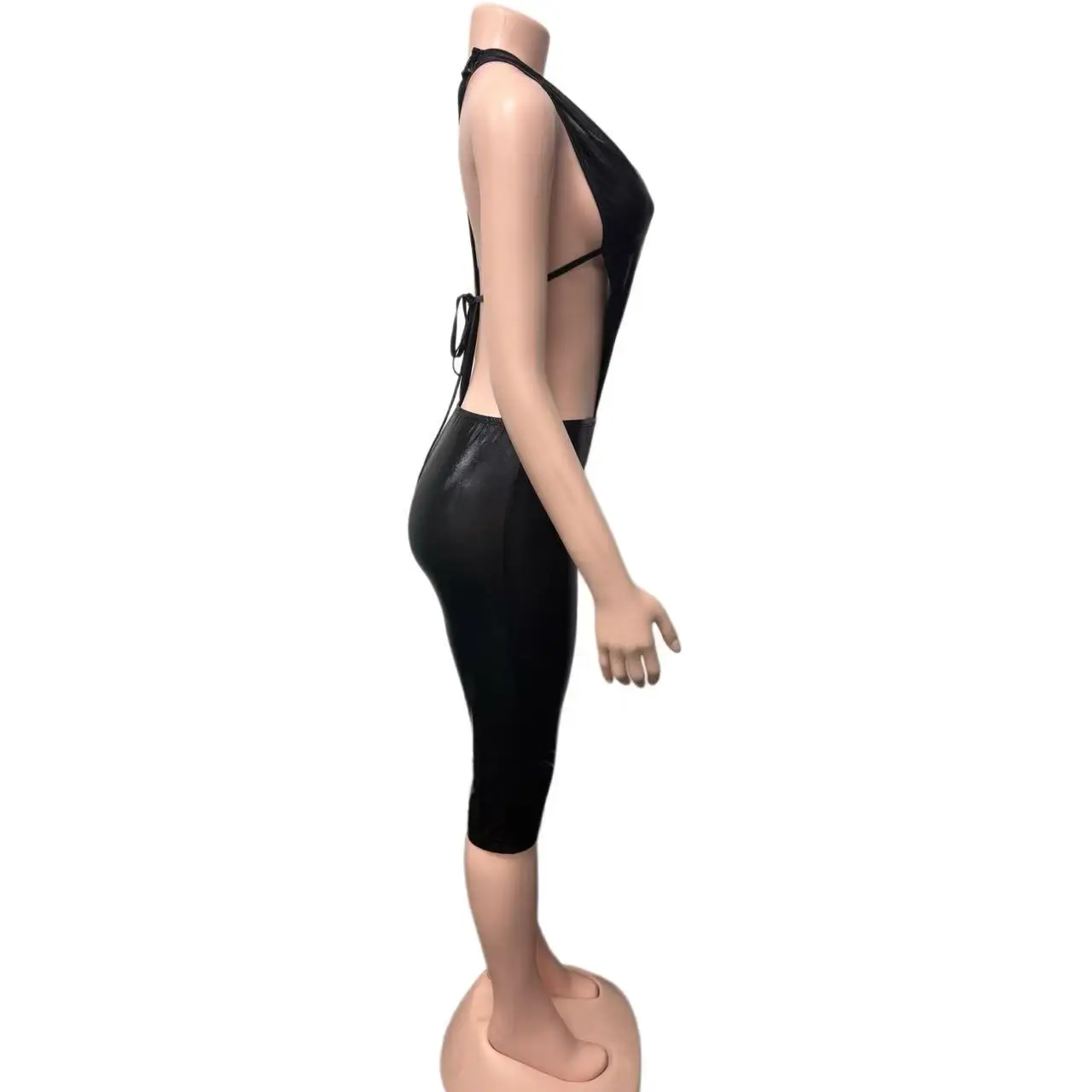 Weird Puss Sexy Women 2 Piece Set Halter Silky Hollow Sexy Backless Sleeveless Bodysuit+Bike Shorts Midnight Matching Clubwear