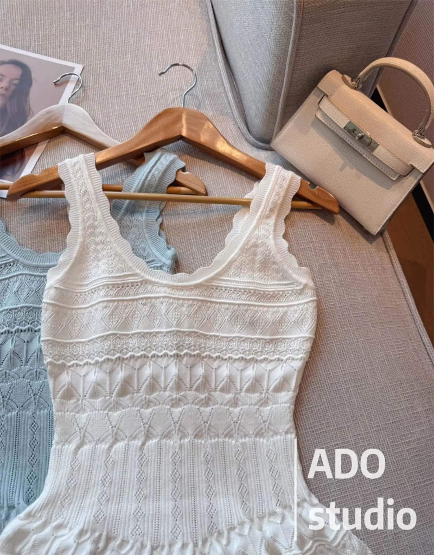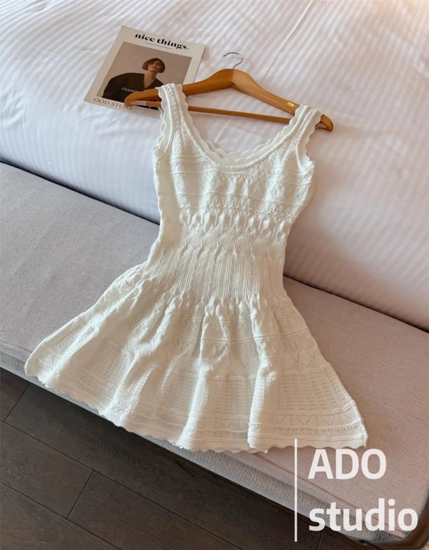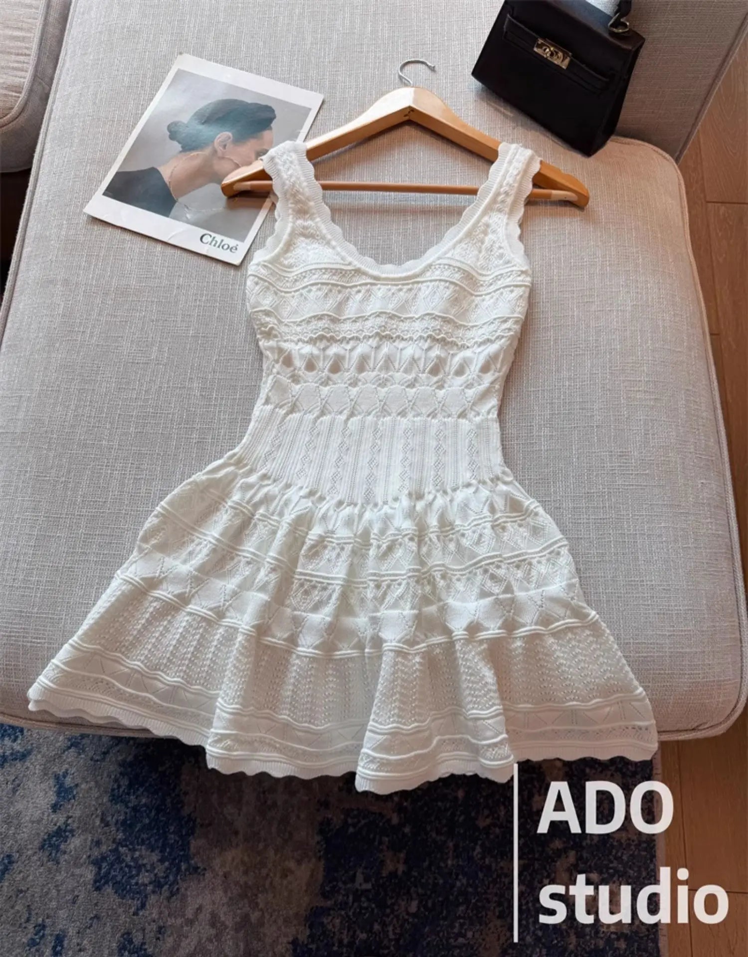 White Sweet A-line Ruffle Edge Knitted Vest Dress Women's Summer French Fashion Slim Temperament Sexy Girl Hollow Short Dress