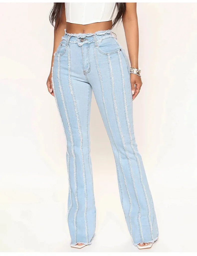 Pantalon en jean évasé bleu taille haute pour femme, style décontracté et tendance