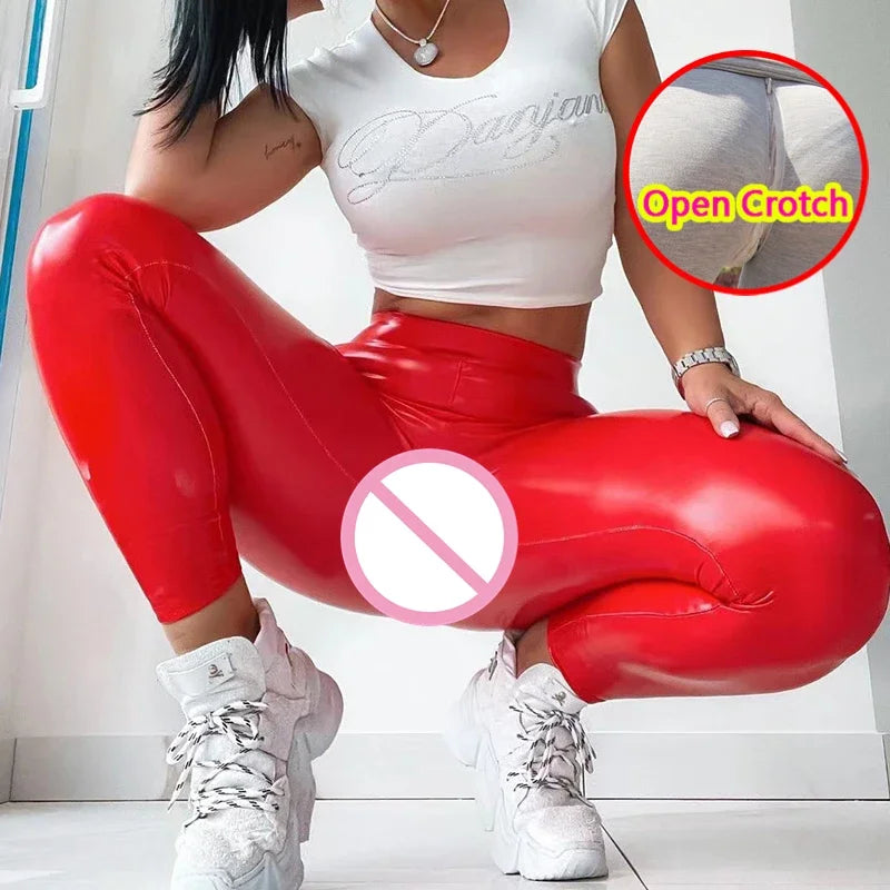 Women High Waist Open Crotch Leather Leggings Outdoor Sex PU Pencil Pant Double Zipper Seamless Faux Latex Slim Club Butt Lifter