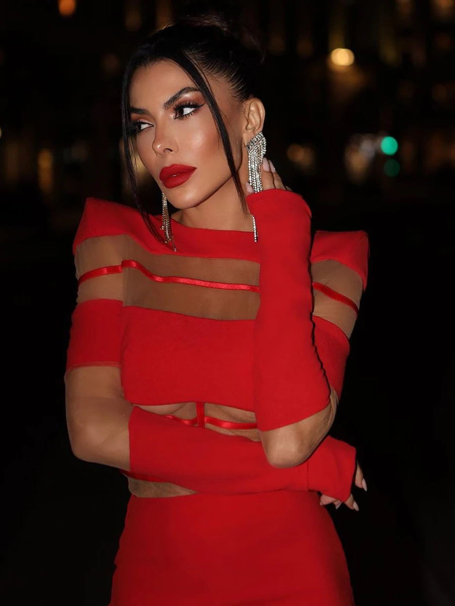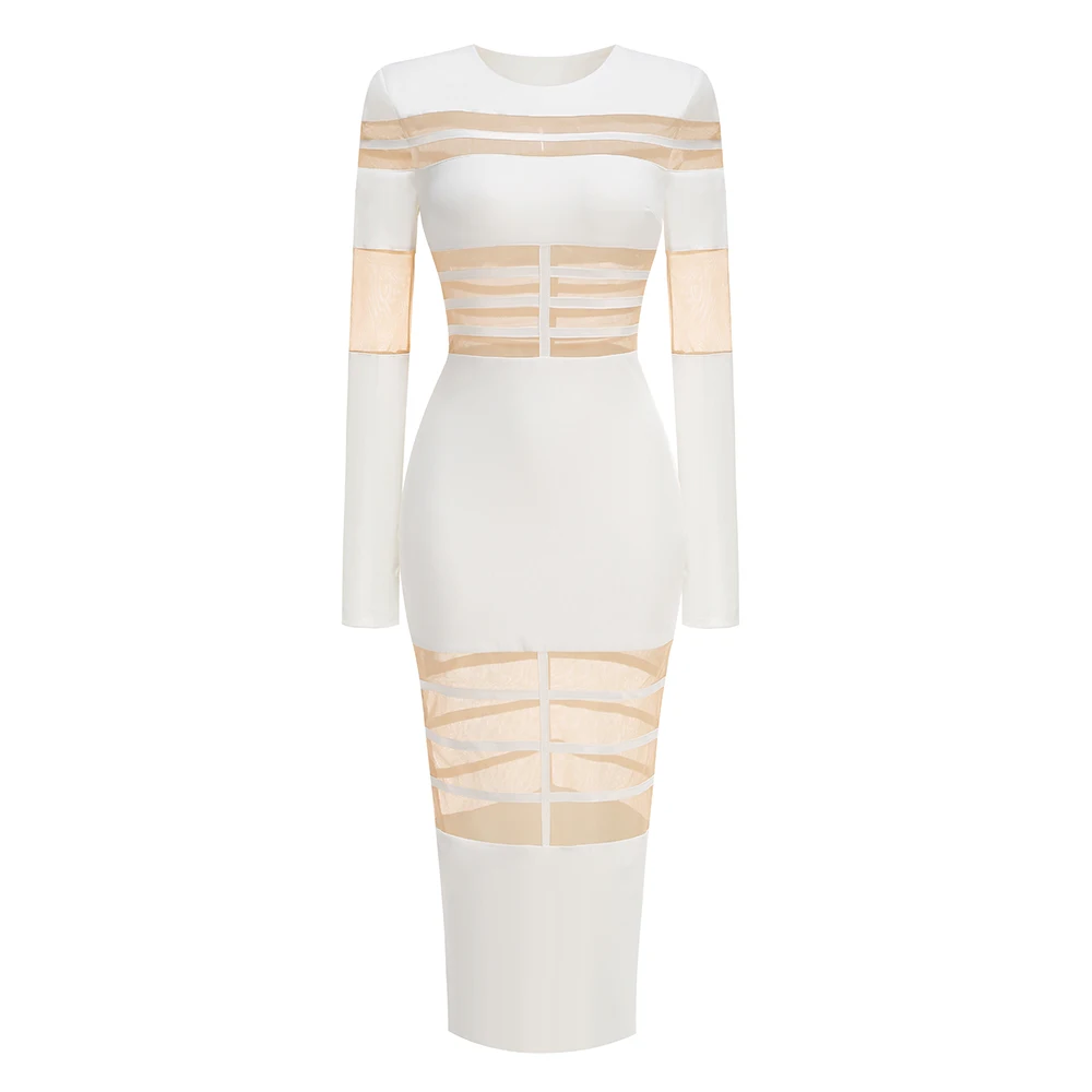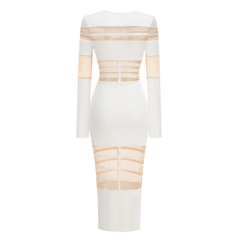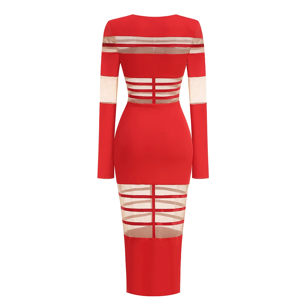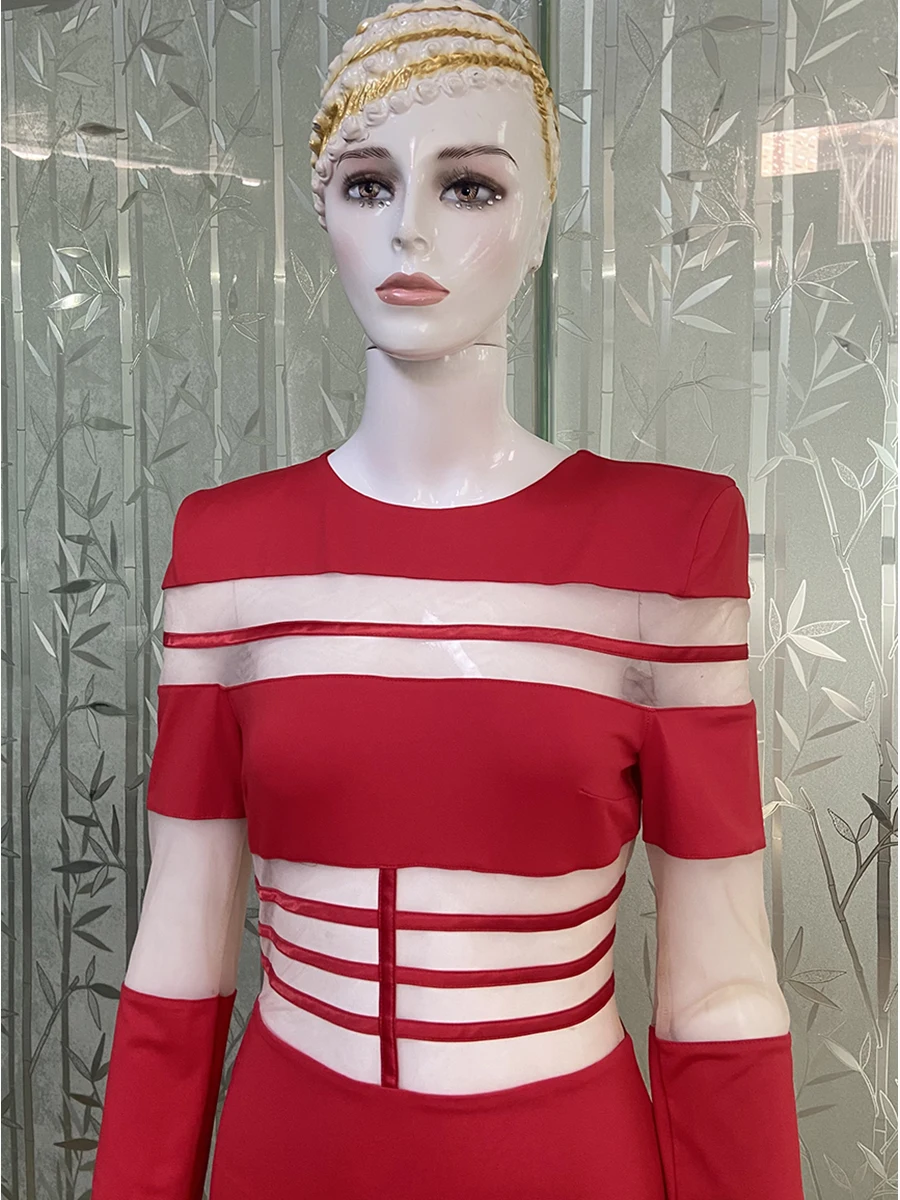 Women's 2025 Sexy Long Sleeve Mesh Ankle-Length Dress Celebrity Sheer Elegant Cut Out Details for Party Evening Club Vestido
