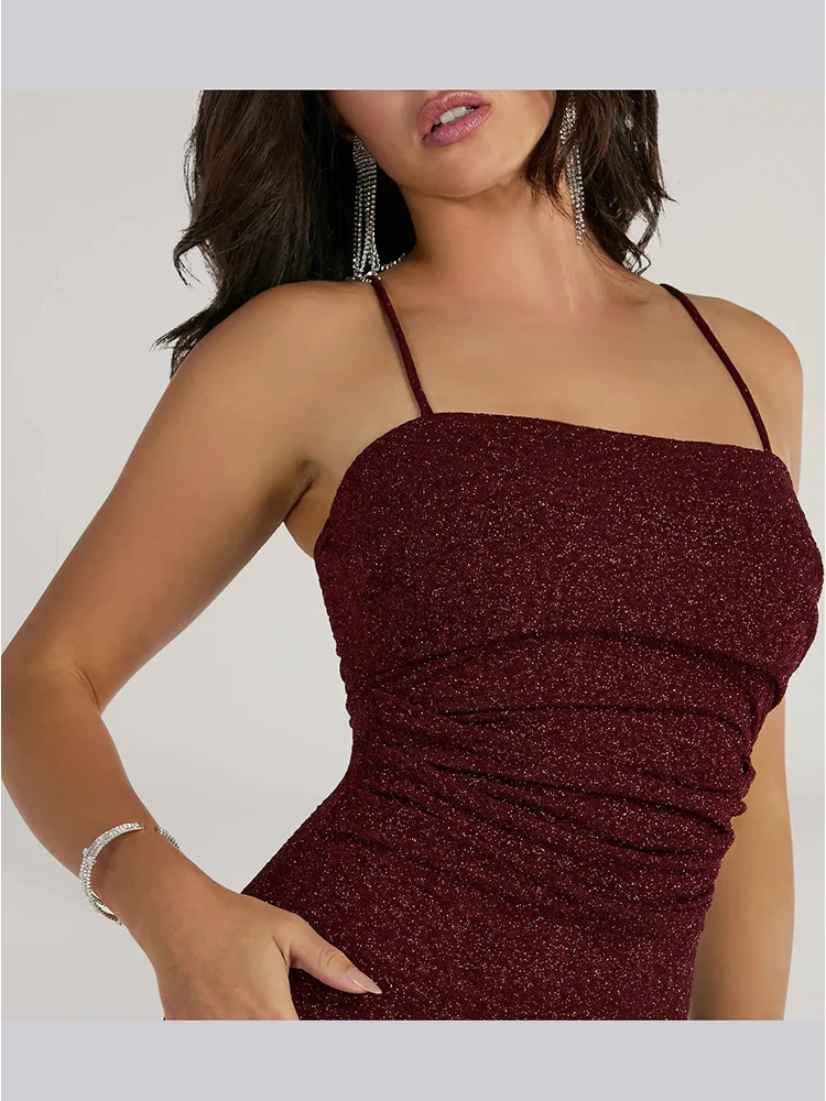Let's start with the fabric. It's a shimmering, high - quality material that not only feels soft against your skin but also has a beautiful sheen that catches the light subtly. The stretchy fabric hugs your curves in all the right places, providing a comfortable and flattering fit.