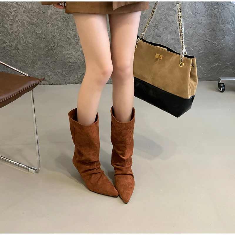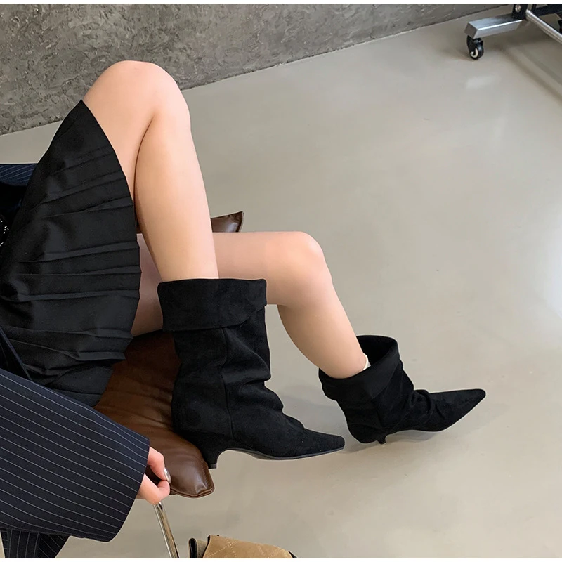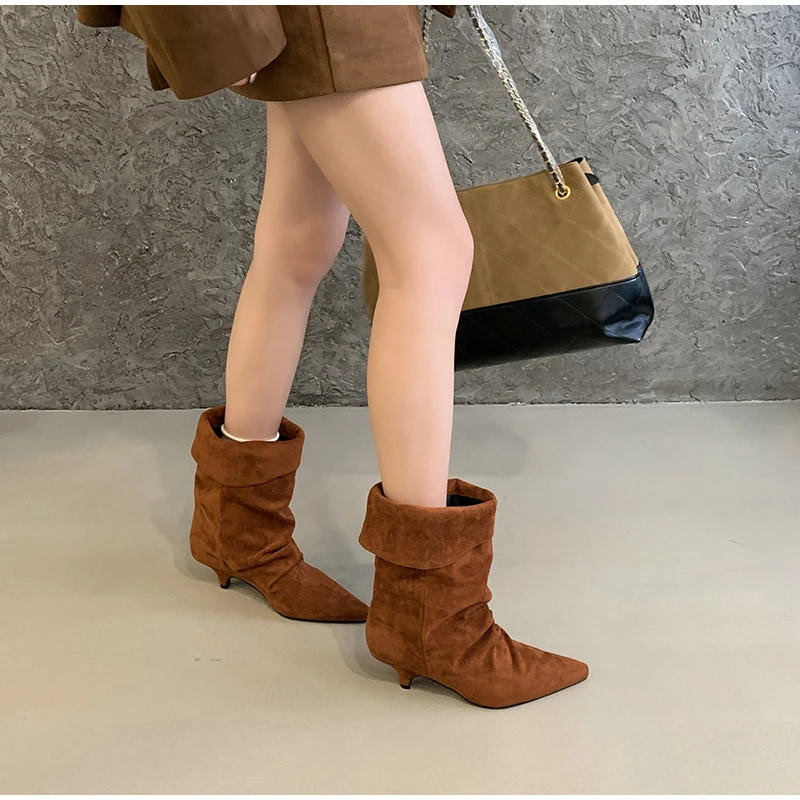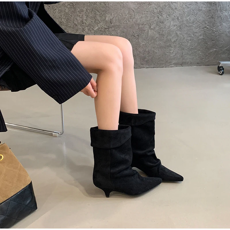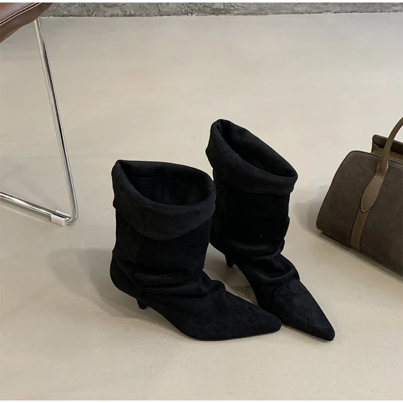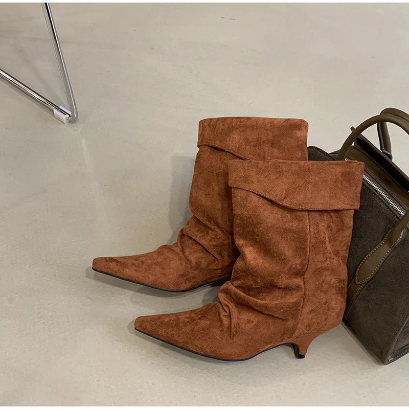 Women's Frosted Low-heeled Boots Fashion Retro Brand Short Boots Pointed Stiletto Boots Pleated Ankle Boot Folded Hem Short Boot