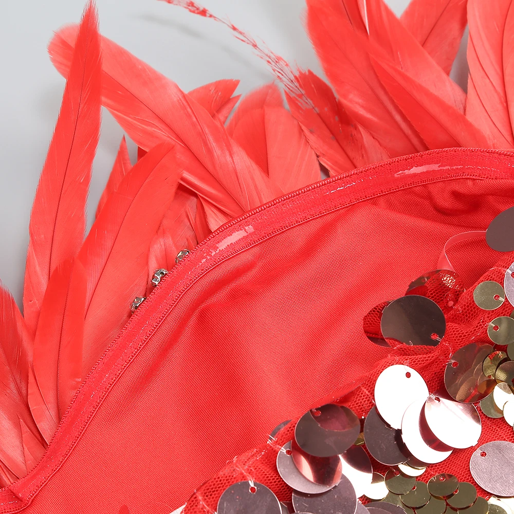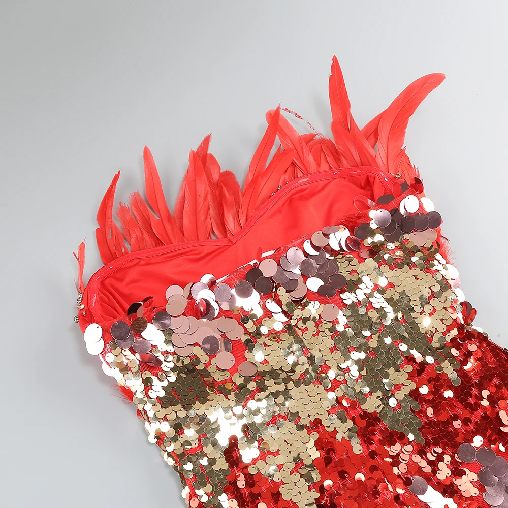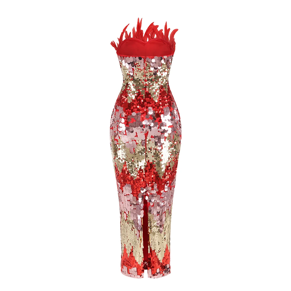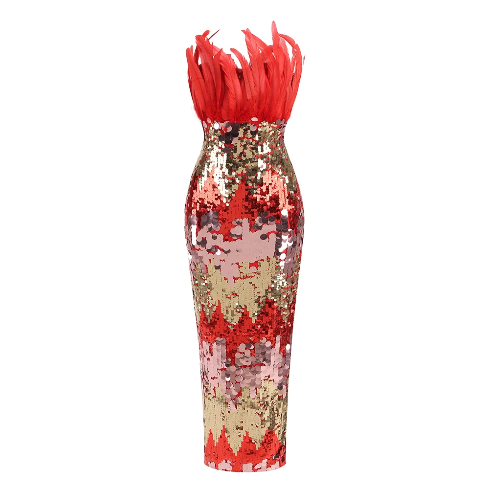 Women's New Stylish Sleeveless Slim Sequin Feather Patchwork Wrap Calf Length Dress Luxurious Evening Party Dress