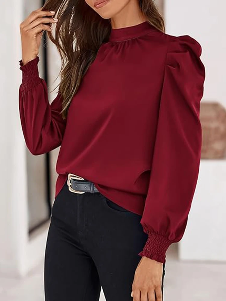 Women's Satin Puff Sleeves Elegant Retro Charm Commuter Style Long-Sleeved Turtleneck Skin-Friendly Fabric Casual Shirt