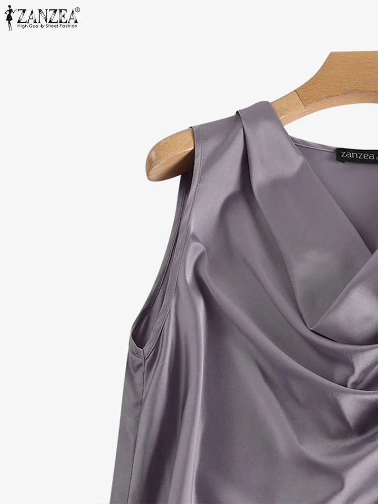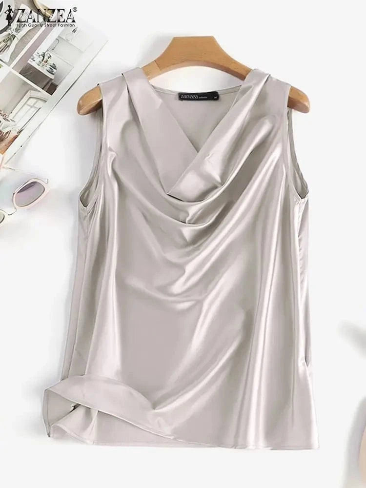 ZANZEA Women Satin Tank Tops Elegant Cowl Neck Sleeveless Blouse Korean Fashion Silk Solid Color Tanks Office Lady Sexy Camisole