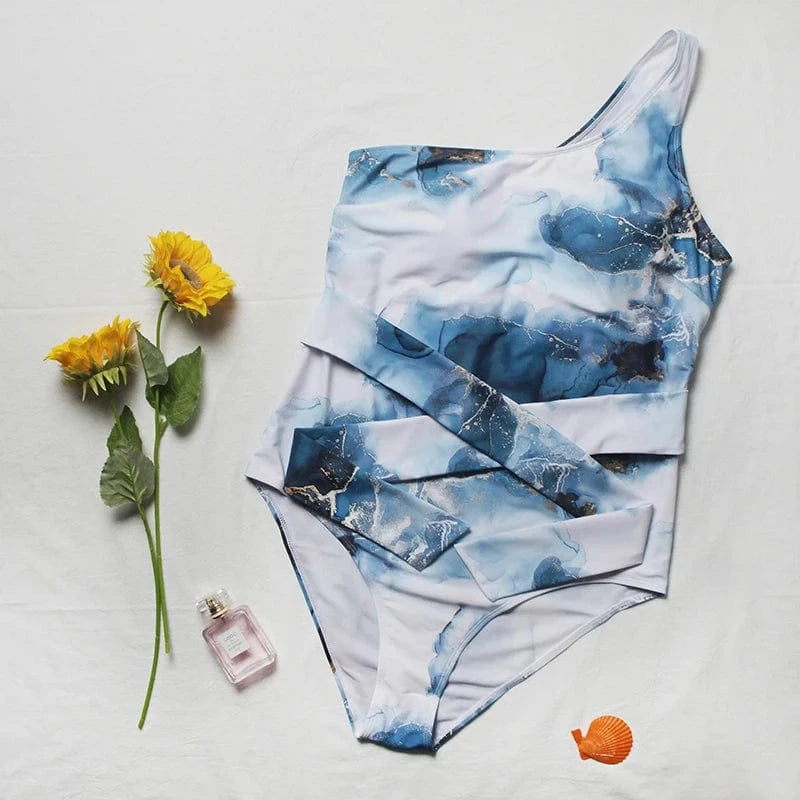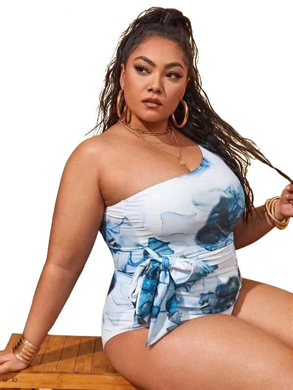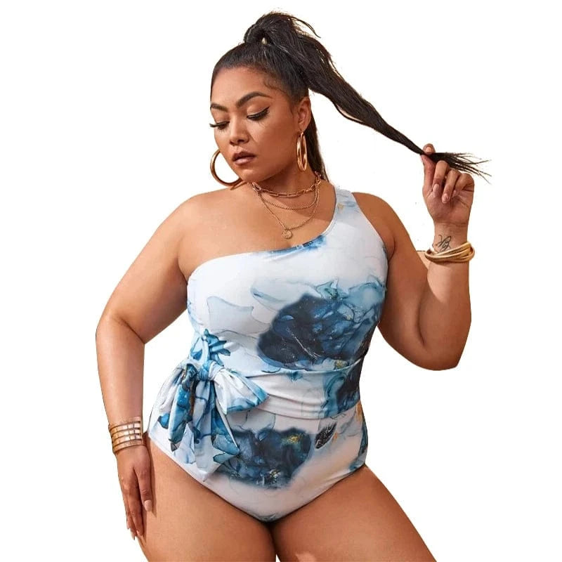 2022 New Design One Piece Swimsuit Plus Size Single Shoulder Swimwear 4x Bow Tie High Cut Leg Printed Beachwear for Fat Women