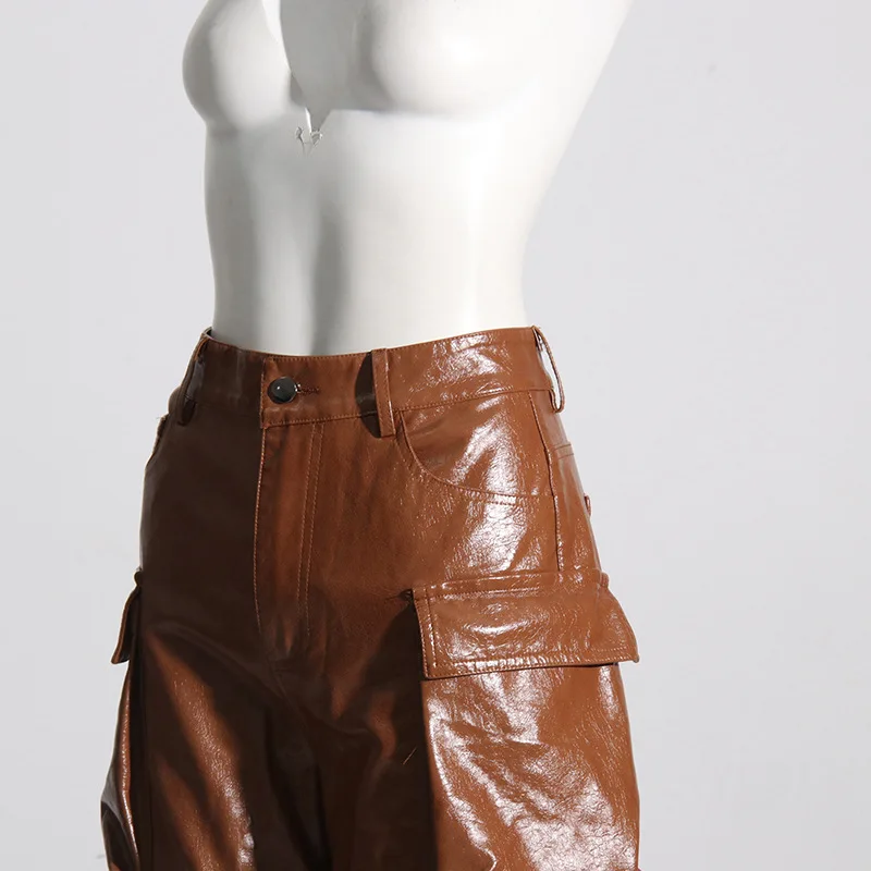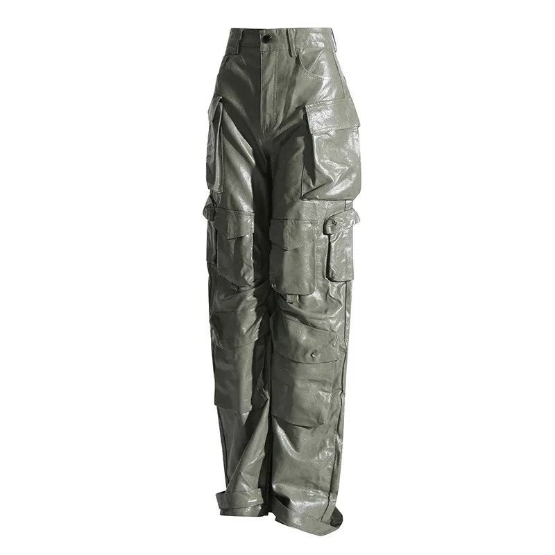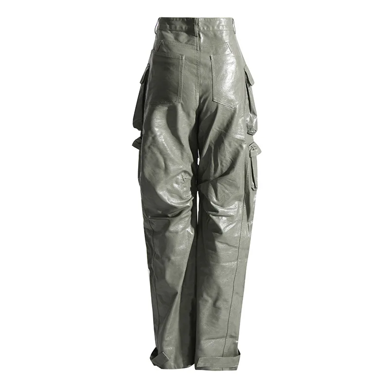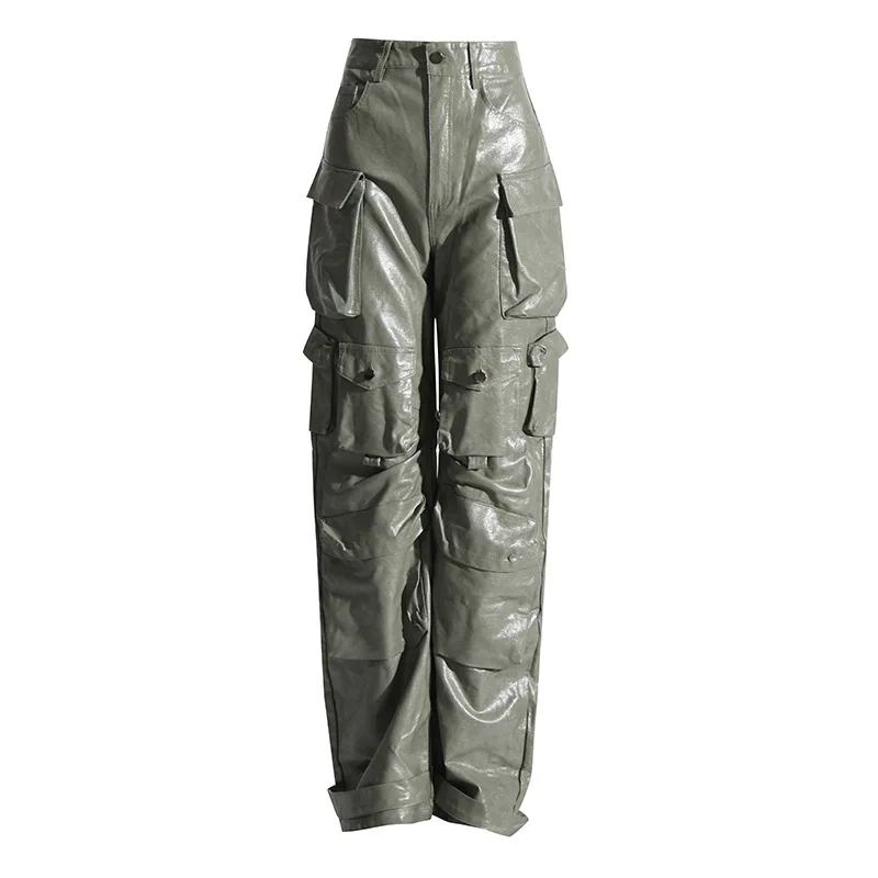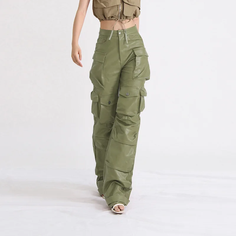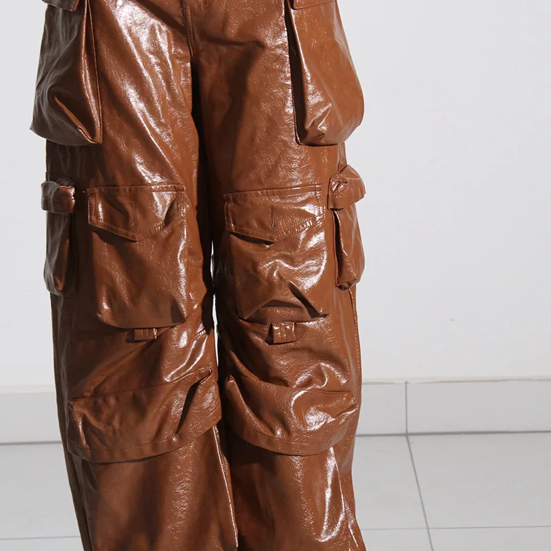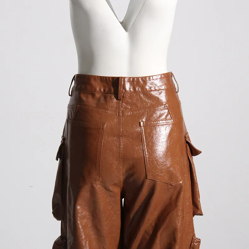2023 Autumn New Arrival Mid Waist Multi Pockets Pu Leather Women Streetwear Solid Color Long Lethar Pants