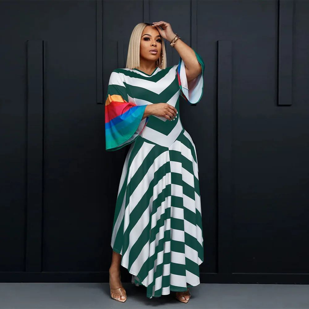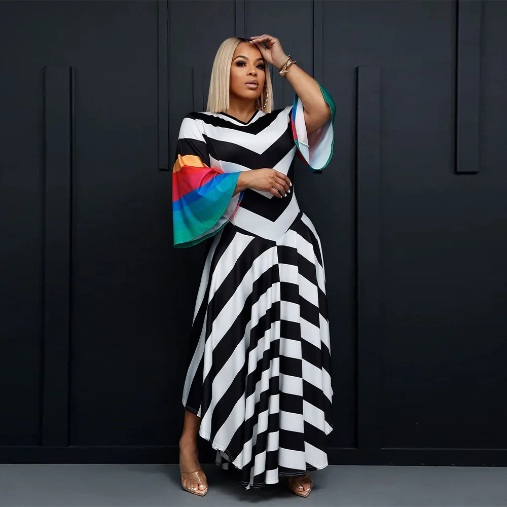 2023 fall fashion maxi dress color block flare sleeve long dress for women casual wear