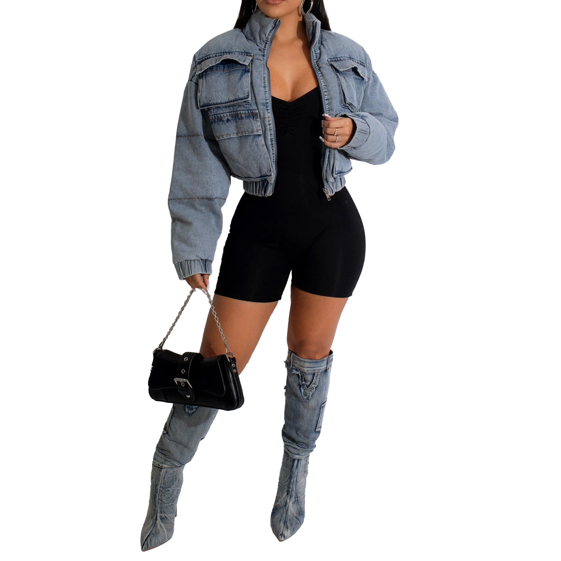 2023 Winter New Design Denim Puffer Jacket Fashionable Multi Pocket Zipper Women Denim Coat