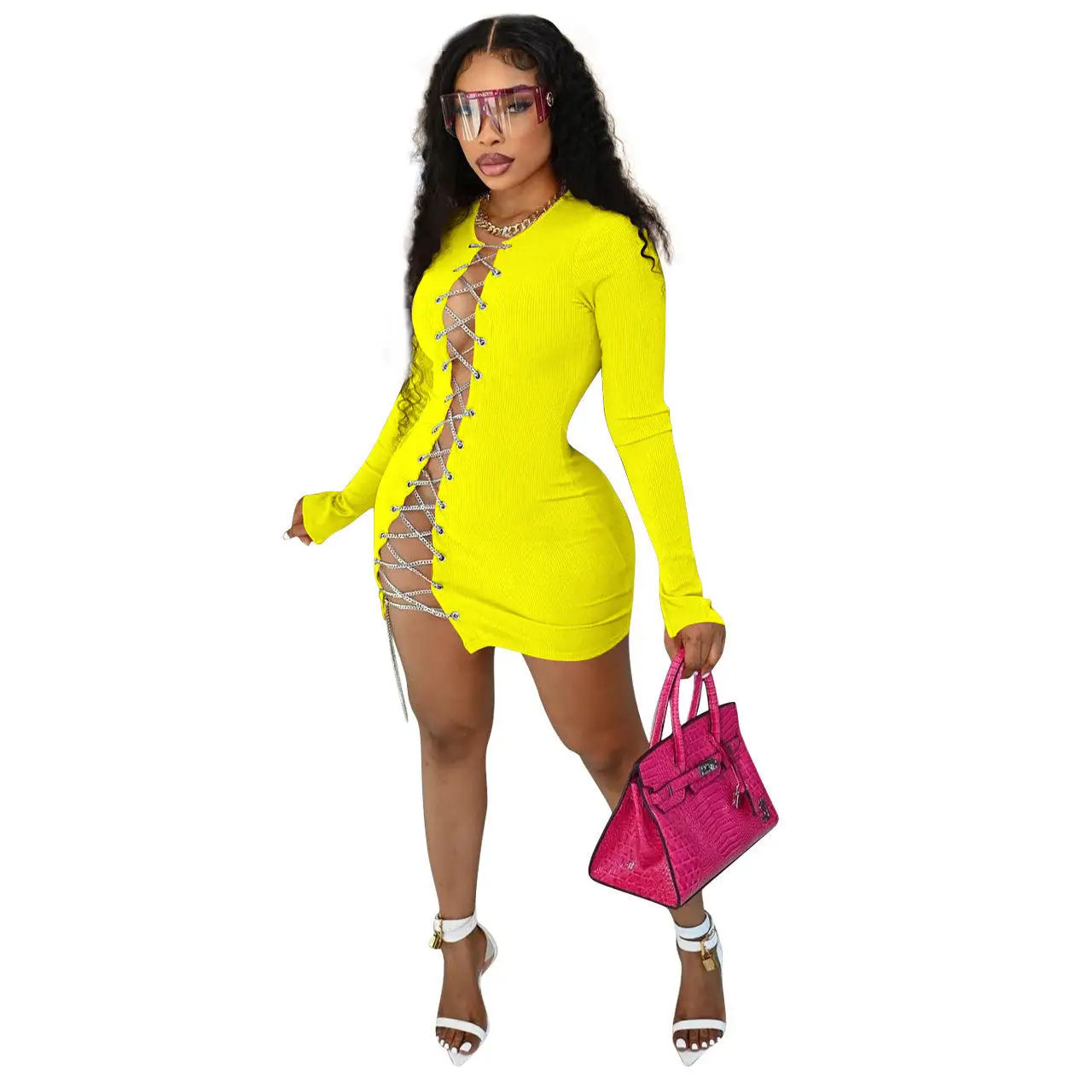 2023 Hot Selling Autumn Custom Logo Solid Color Round Neck Long Sleeve Fashion Sexy Mini Chain Dress Clothes Women