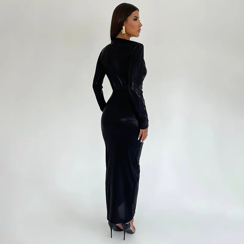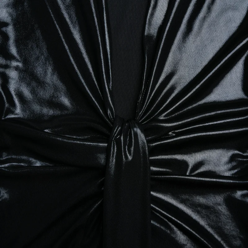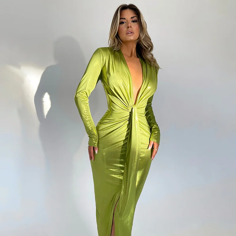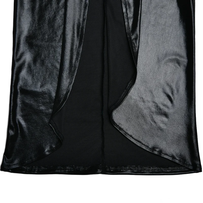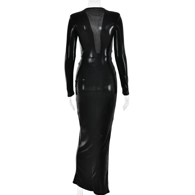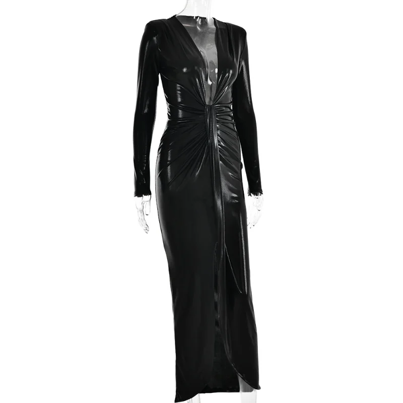 2023 Hot Selling New Dress Sexy Glossy V-neck Long Sleeve Patchwork Pleated Dress Leather skirt