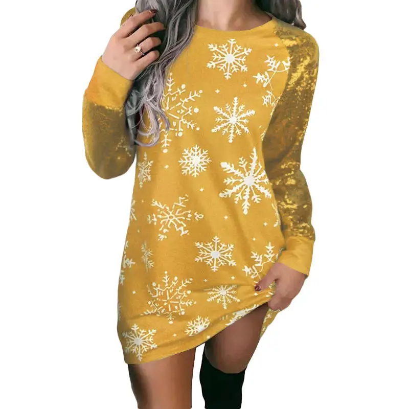 2023 Hot Selling Winter Autumn Snowflake Coat Patchwork Color Snowflake Print Casual Dress Long Sleeve Women's Christmas Dress