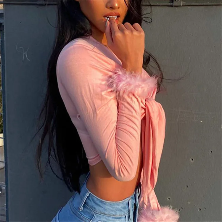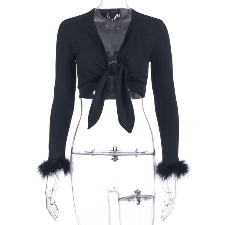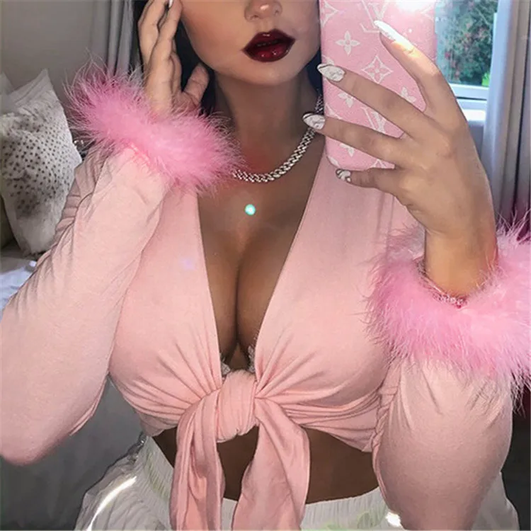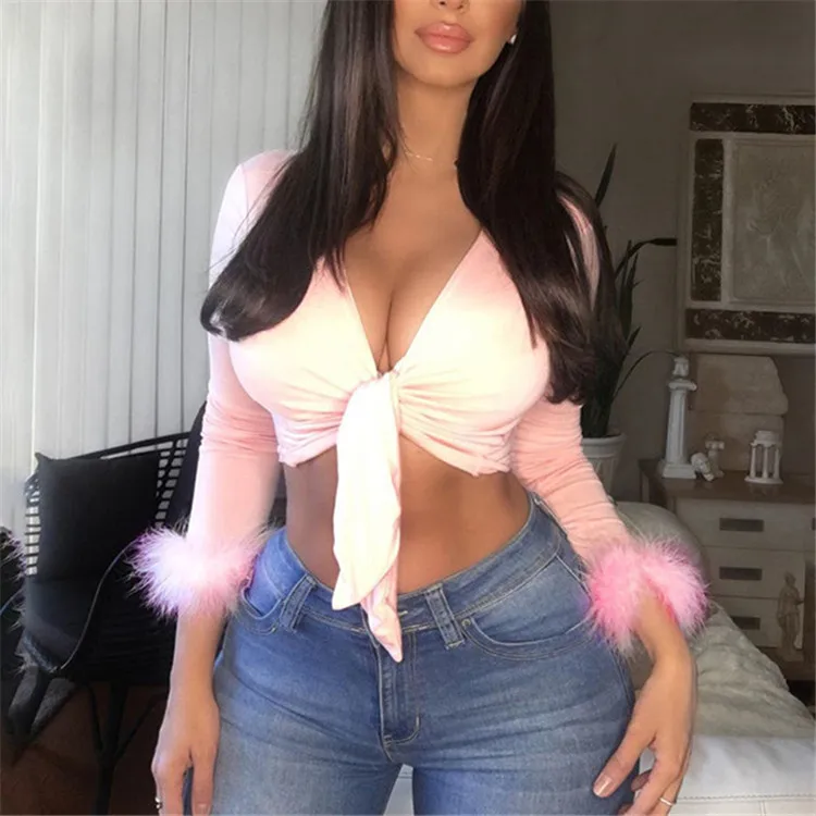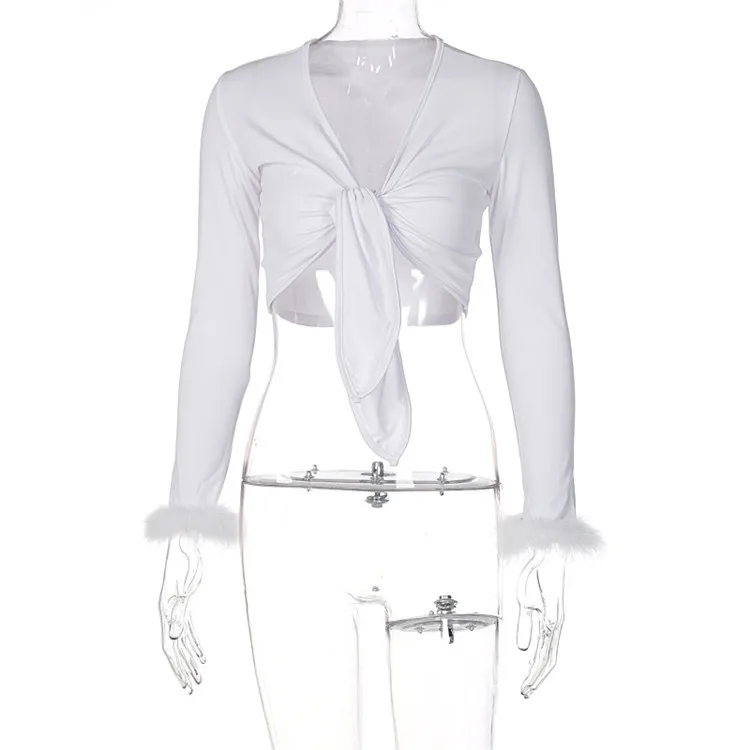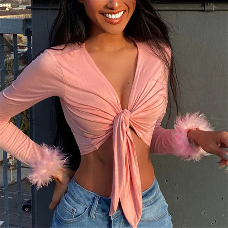 2023 Long Sleeve Fur V-Neck Wrapped Bandage Sexy Crop Tops Autumn Winter Women Streetwear Club Party Outfits T-Shirts