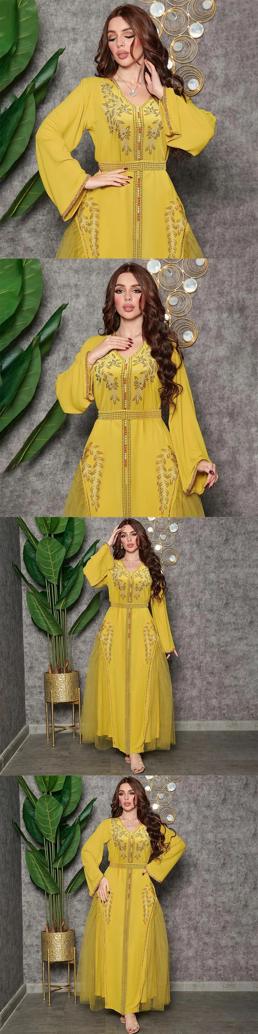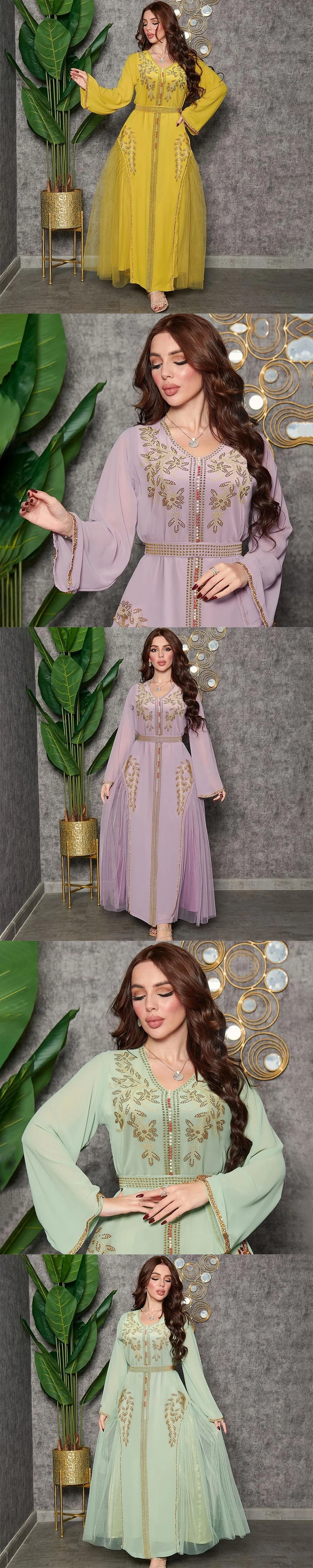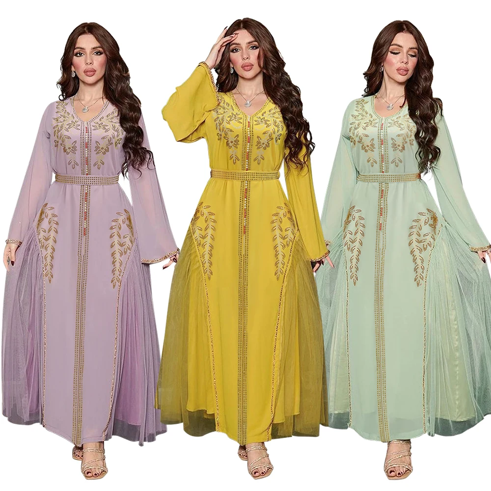 2023 Middle East Arabic High Quality Chiffon Hot Fix Diamond V Neck Kaftan robe muslim abaya women muslim dress