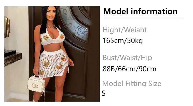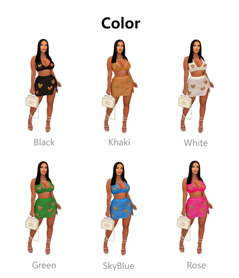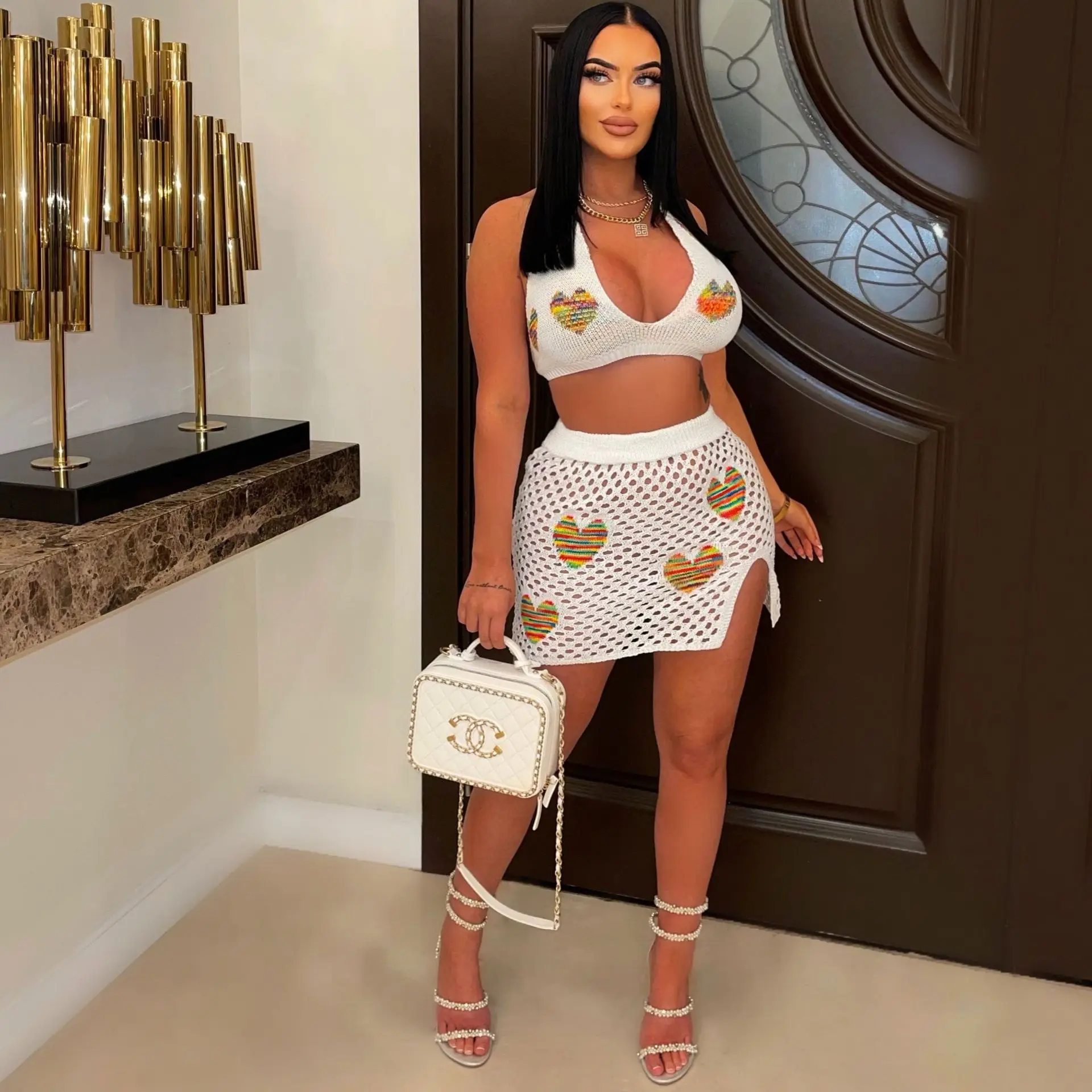 2023 New arrivals cover up beachwear ladies knit halter crop top and skirt set heart jacquard two piece set women clothing sexy