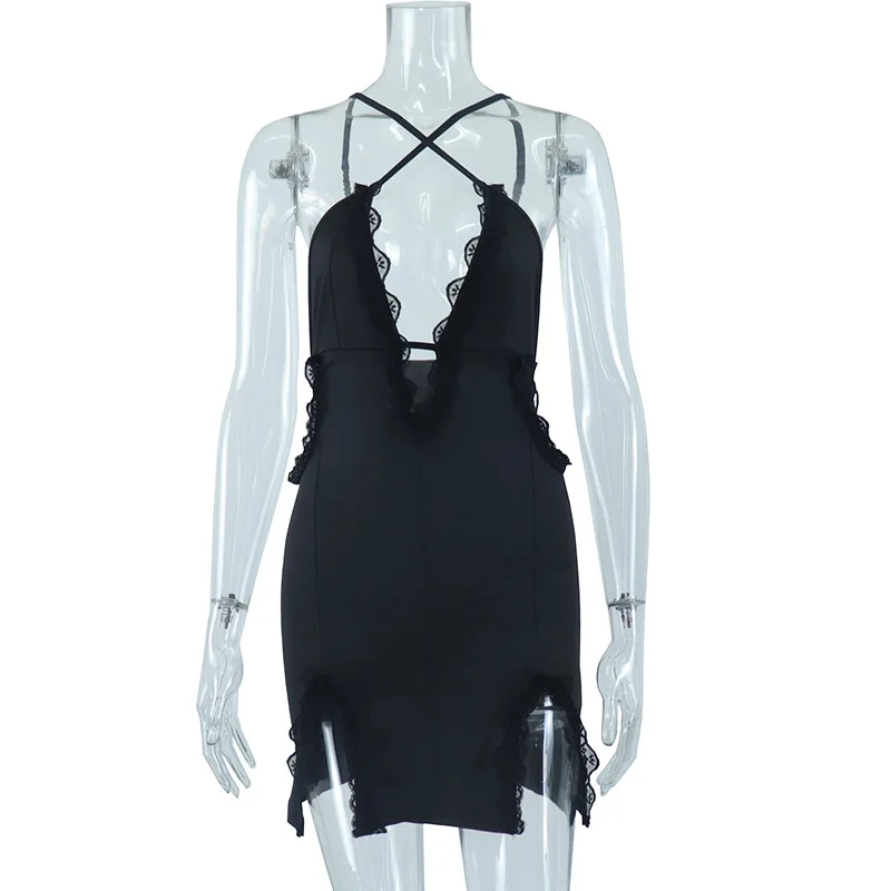 2023 New Style Sling Hollowed Out Street Trendsetter Lace Splicing Split Hip Wrap Dress Trend Sexy Black Lace Mini Dresses