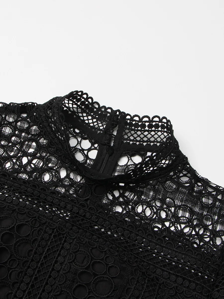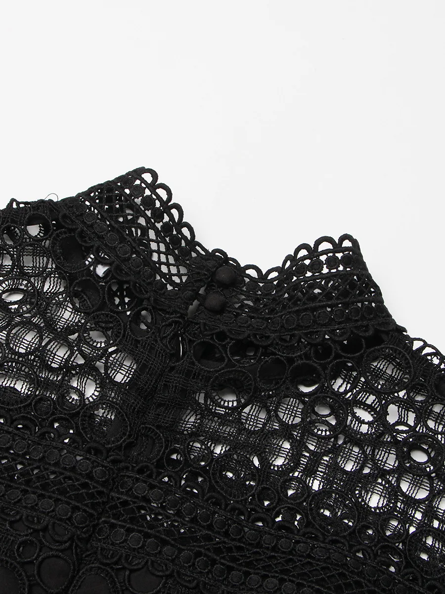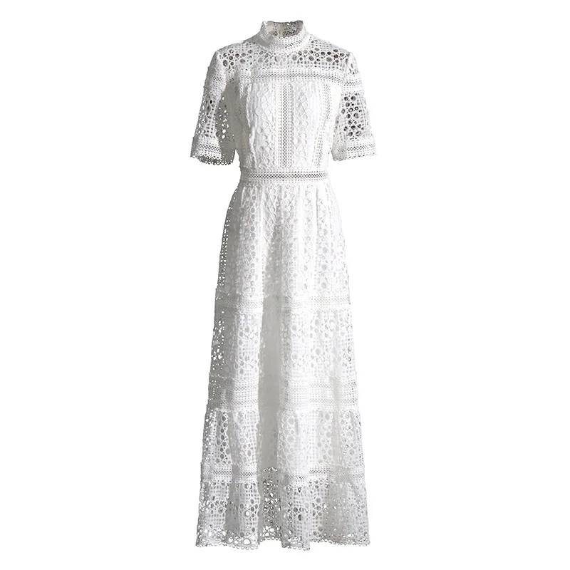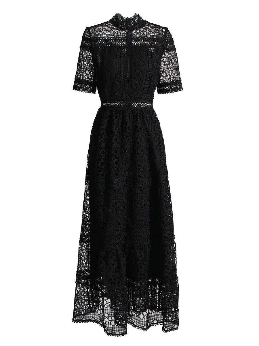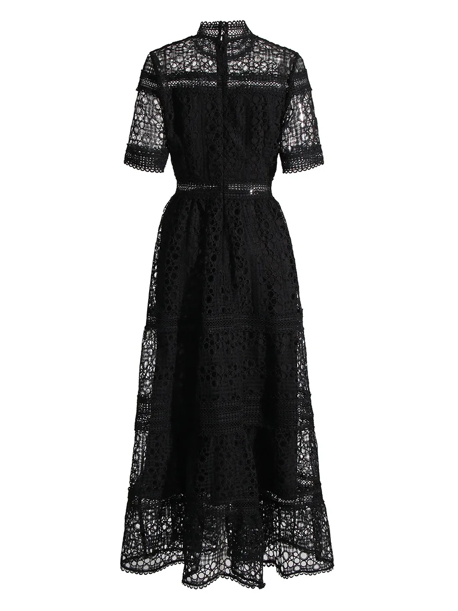 2023 new women's long dress stand collar middle sleeve sexy hollow out lace simple dress
