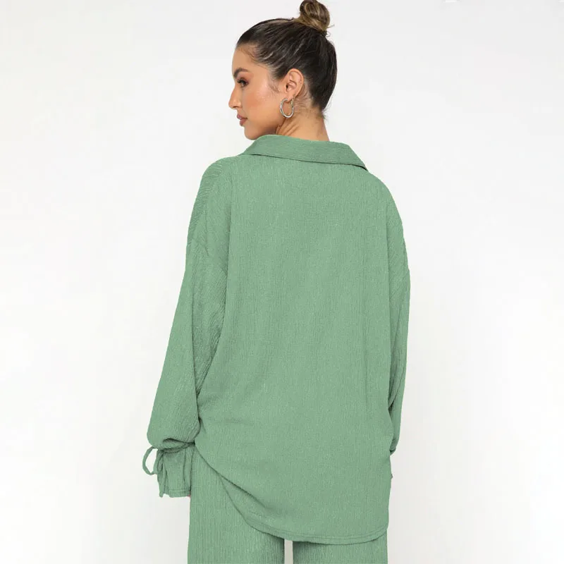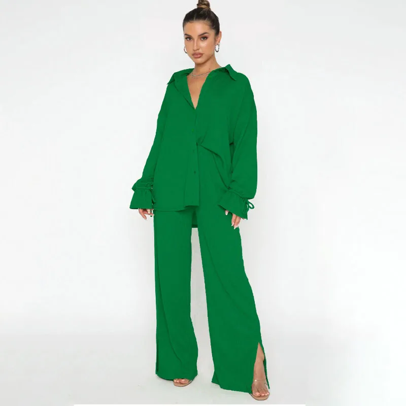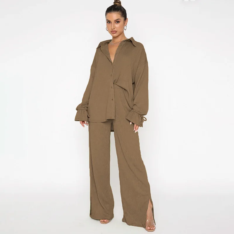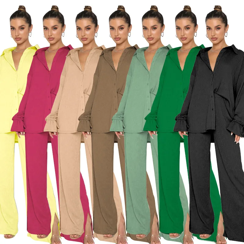 2023 Pure color lapel single -breasted long -sleeved strap women's fashion trousers Two-piece Set