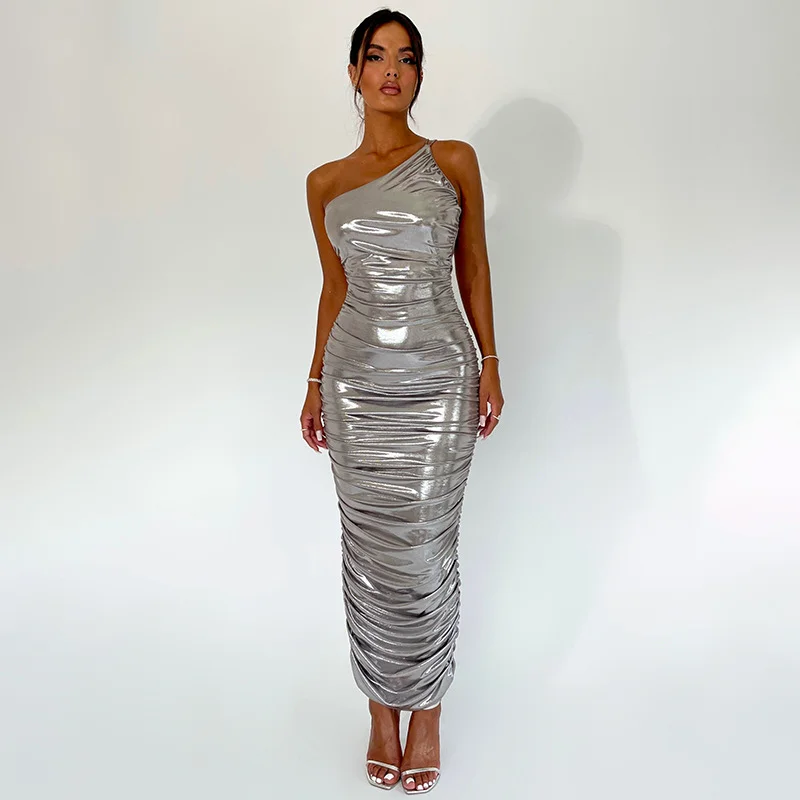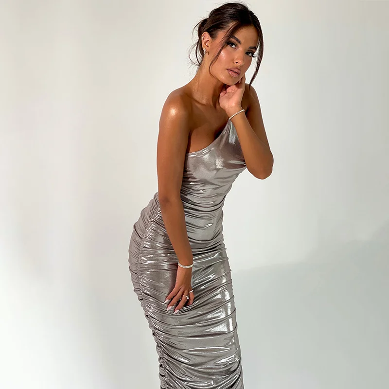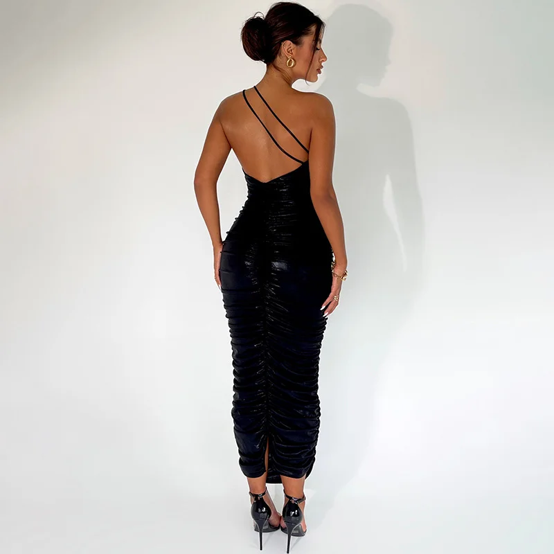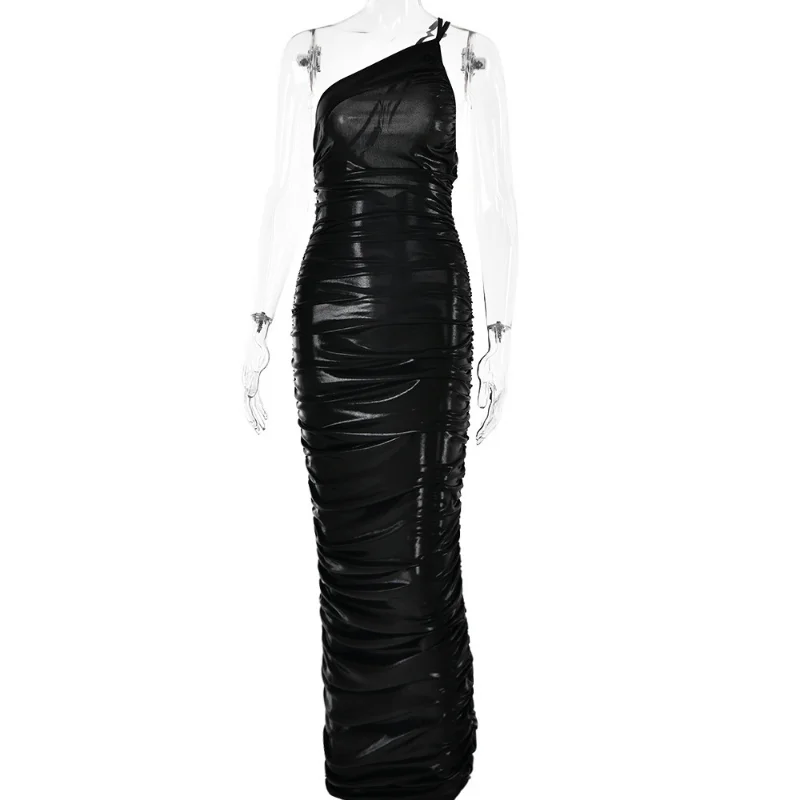 2023 Sexy Fashion Strap Oblique Neck Slim Fit PU Shiny Leather Dress