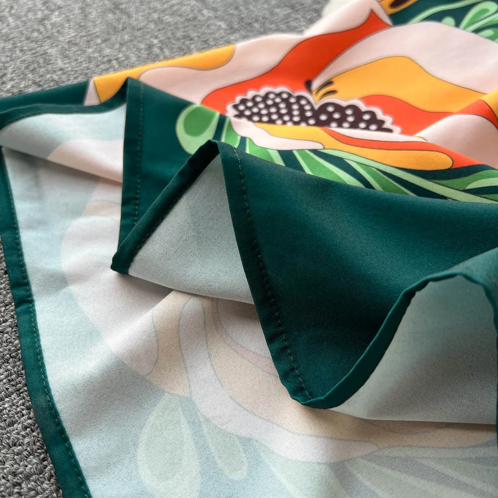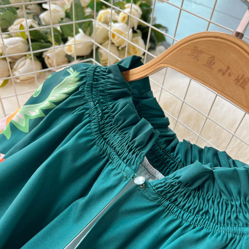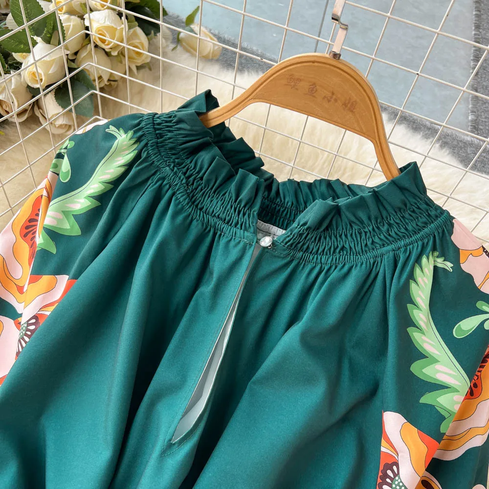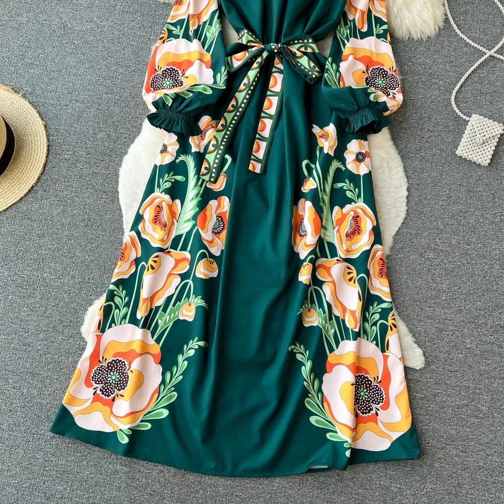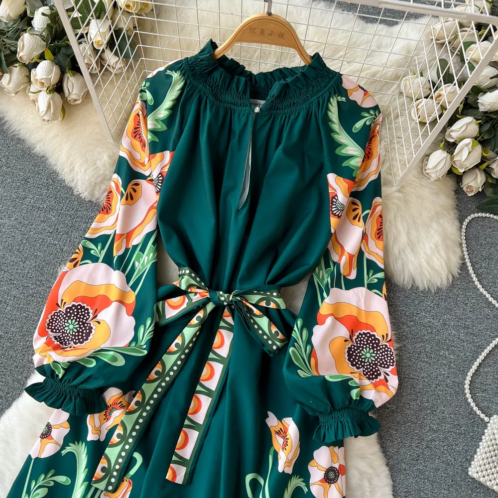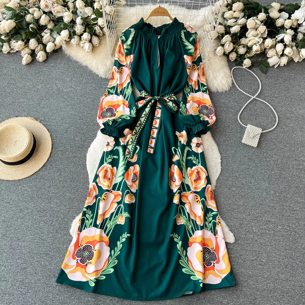 2023 Stylish Printed Dress Female Stand-up Collar Closed Waist Lace-up Large Swing A-line Over-the-knee Long Dress