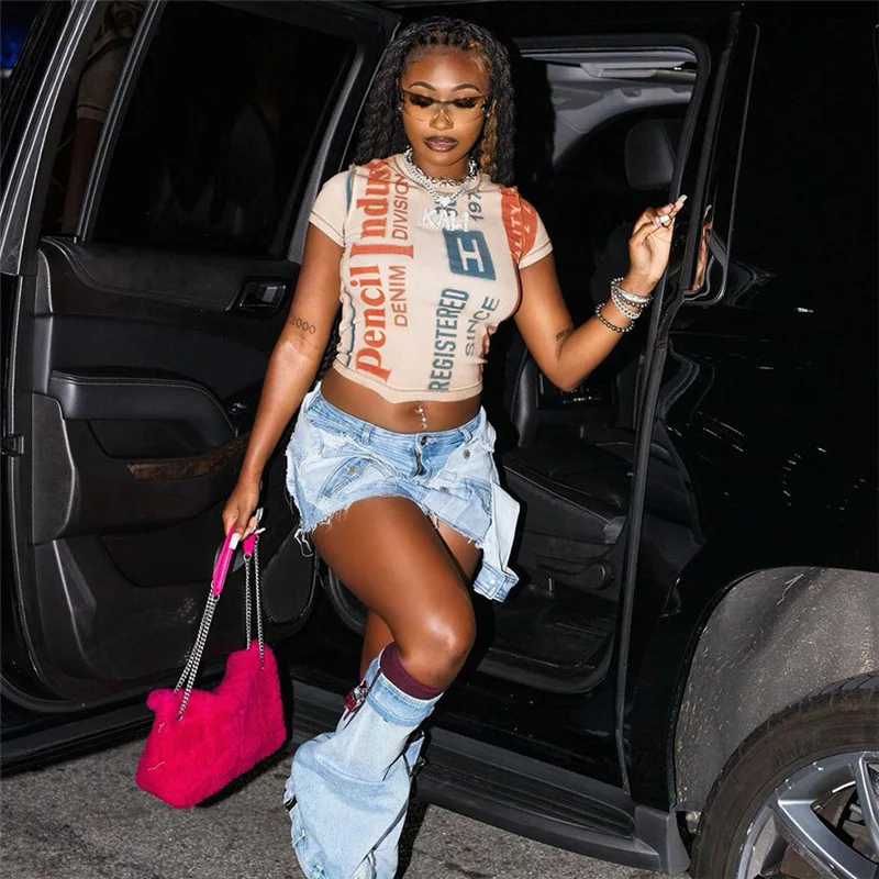 2023 Summer Fashion Letter Print Round Neck Short Sleeve Short Tops Women