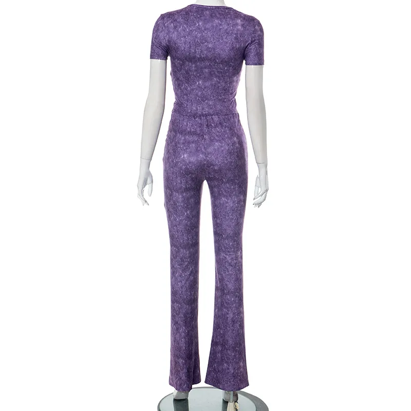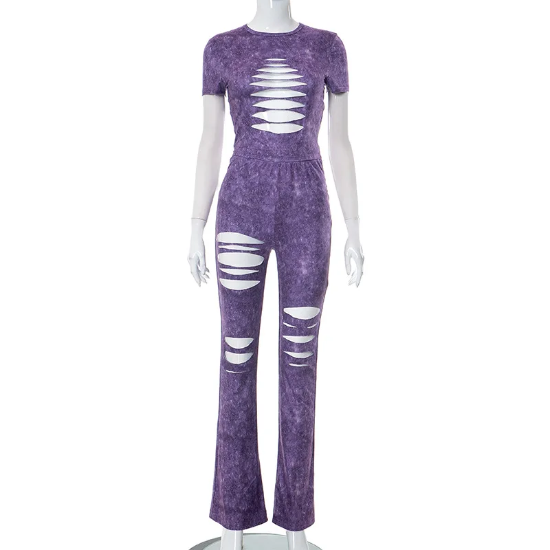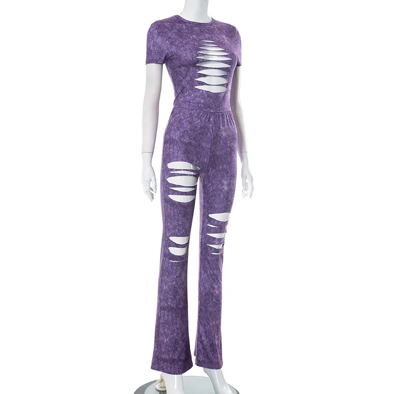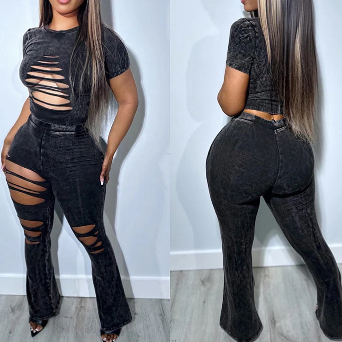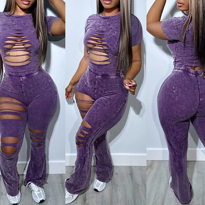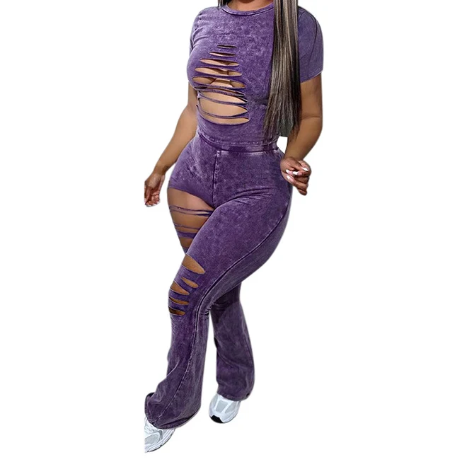 2023 Summer New Arrival O-neck Short Sleeve Top Long Pants Sexy Hollow Out 2 Piece Outfit Set Women