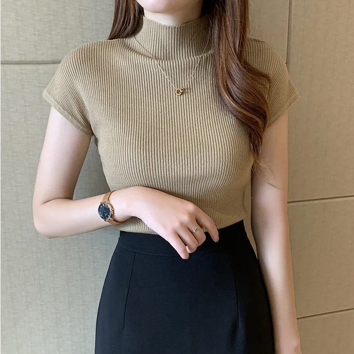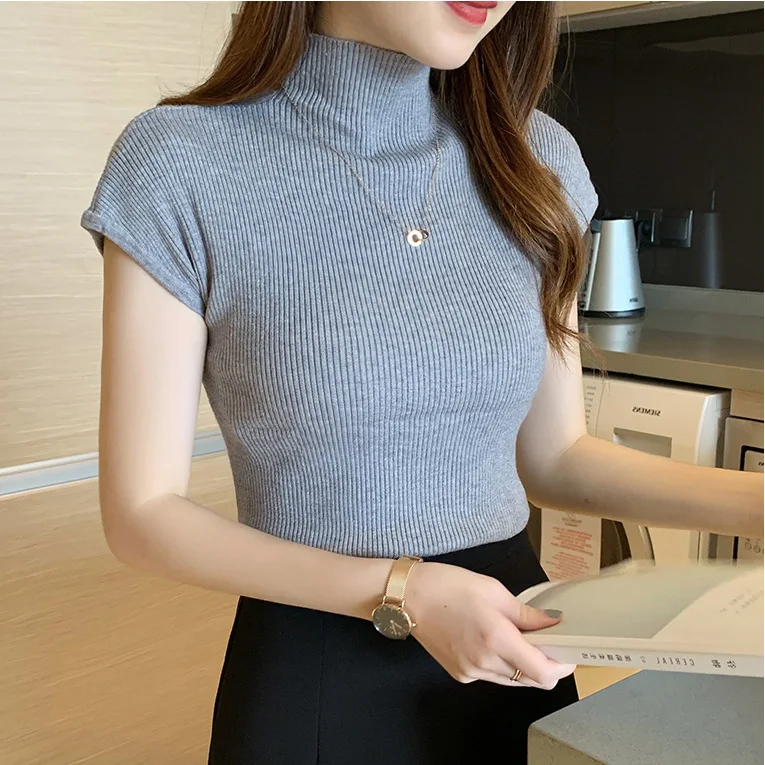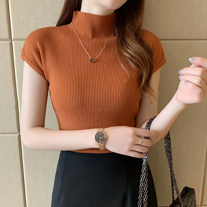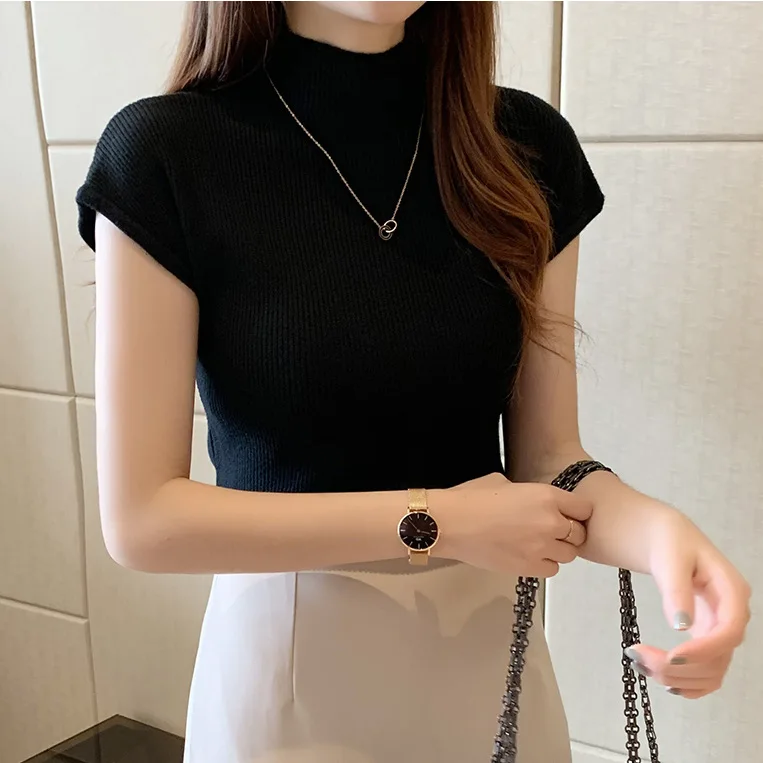 2023 Summer new semi-high collar bottoming shirt women's short-sleeved knitwear tight sweater short slim top