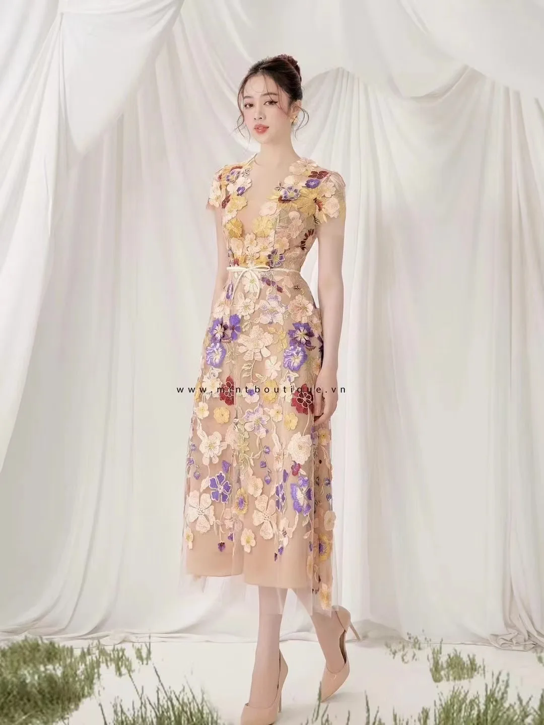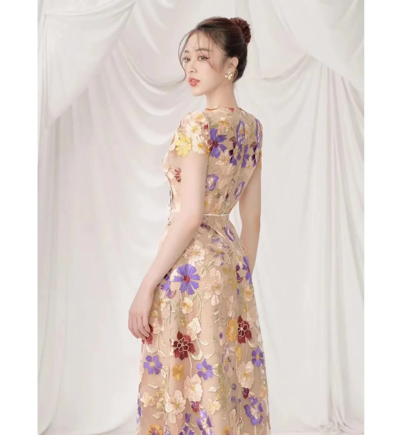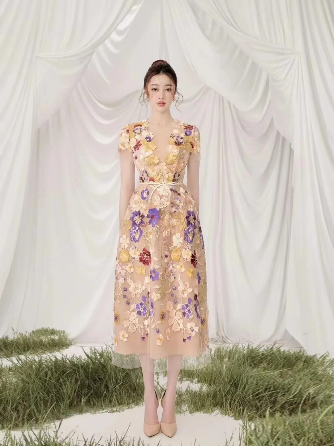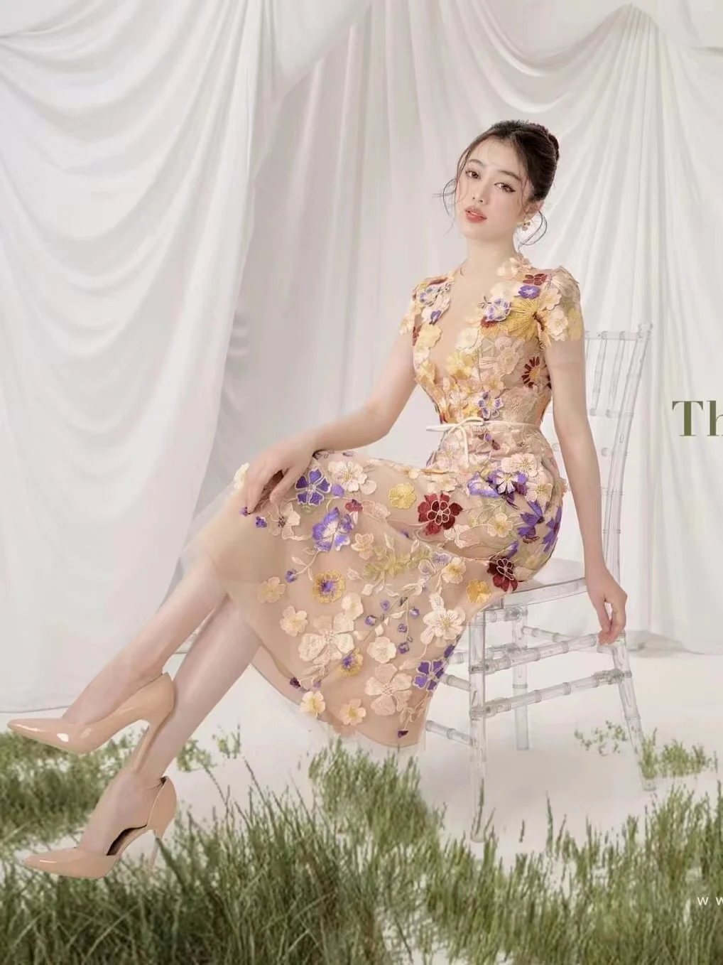 2023 Summer Petal Fashion Design Translucent Lace Strap V Neck Sexy Elegant Skinny Long Dresses Evening Dresses Women's Dresses