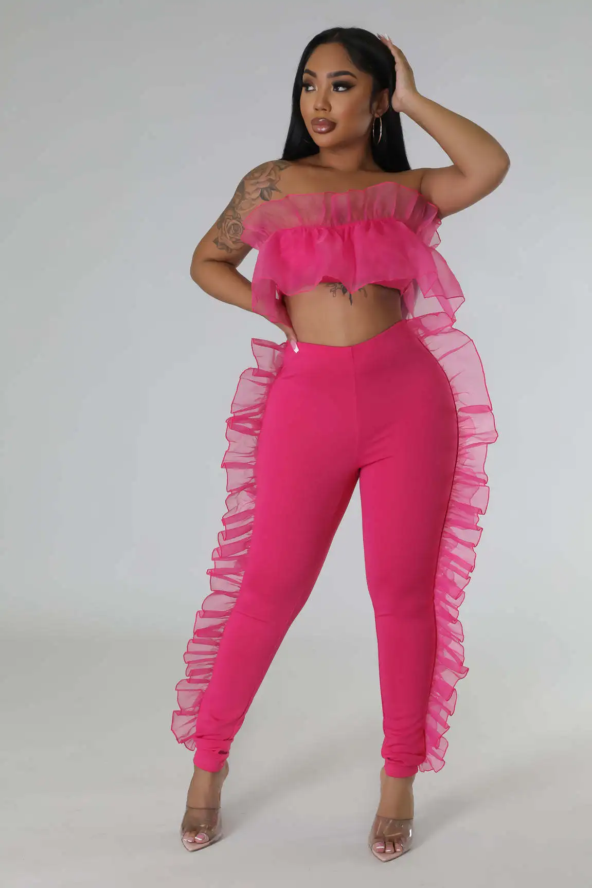 wholesale new arrived long sleeve trousers sexy neon solid color stacked pants 2 piece crop top set outfits