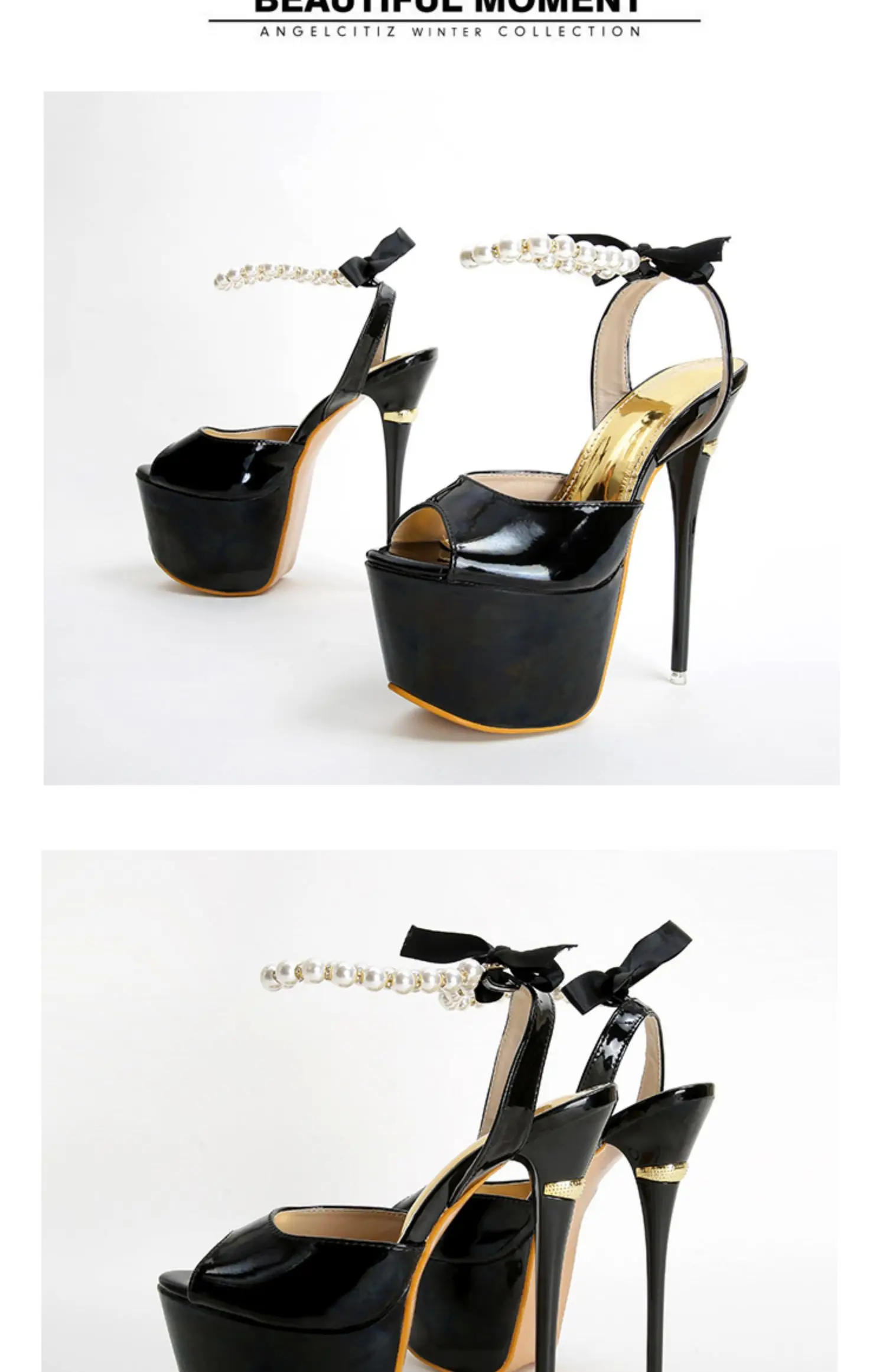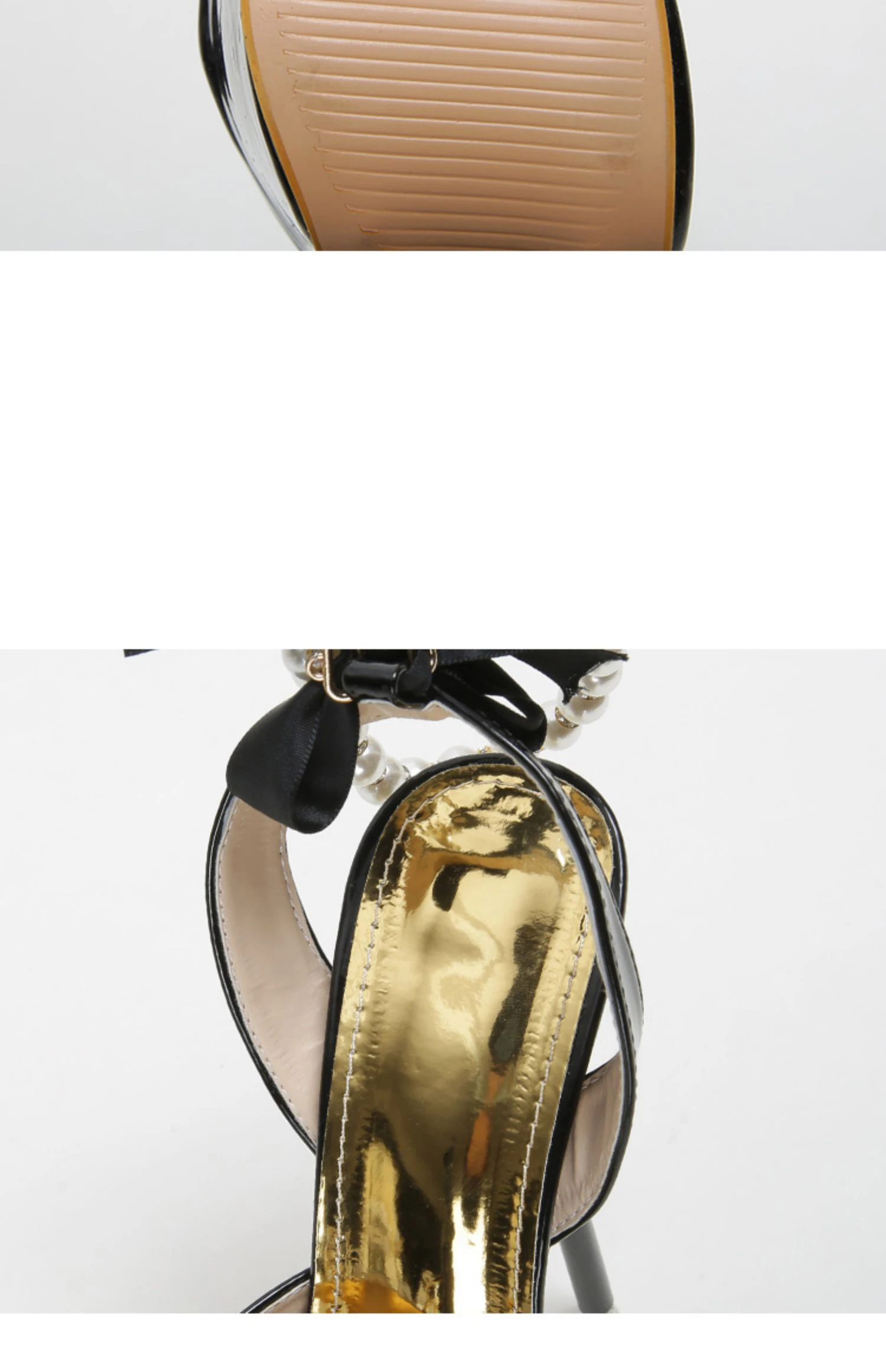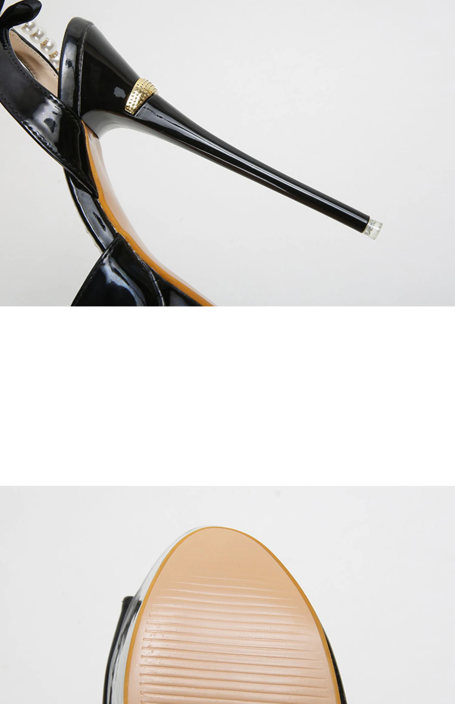 2023 Summer shallow patent leather back empty thin heel fish mouth pearl buckle ultra-high heel female sandals