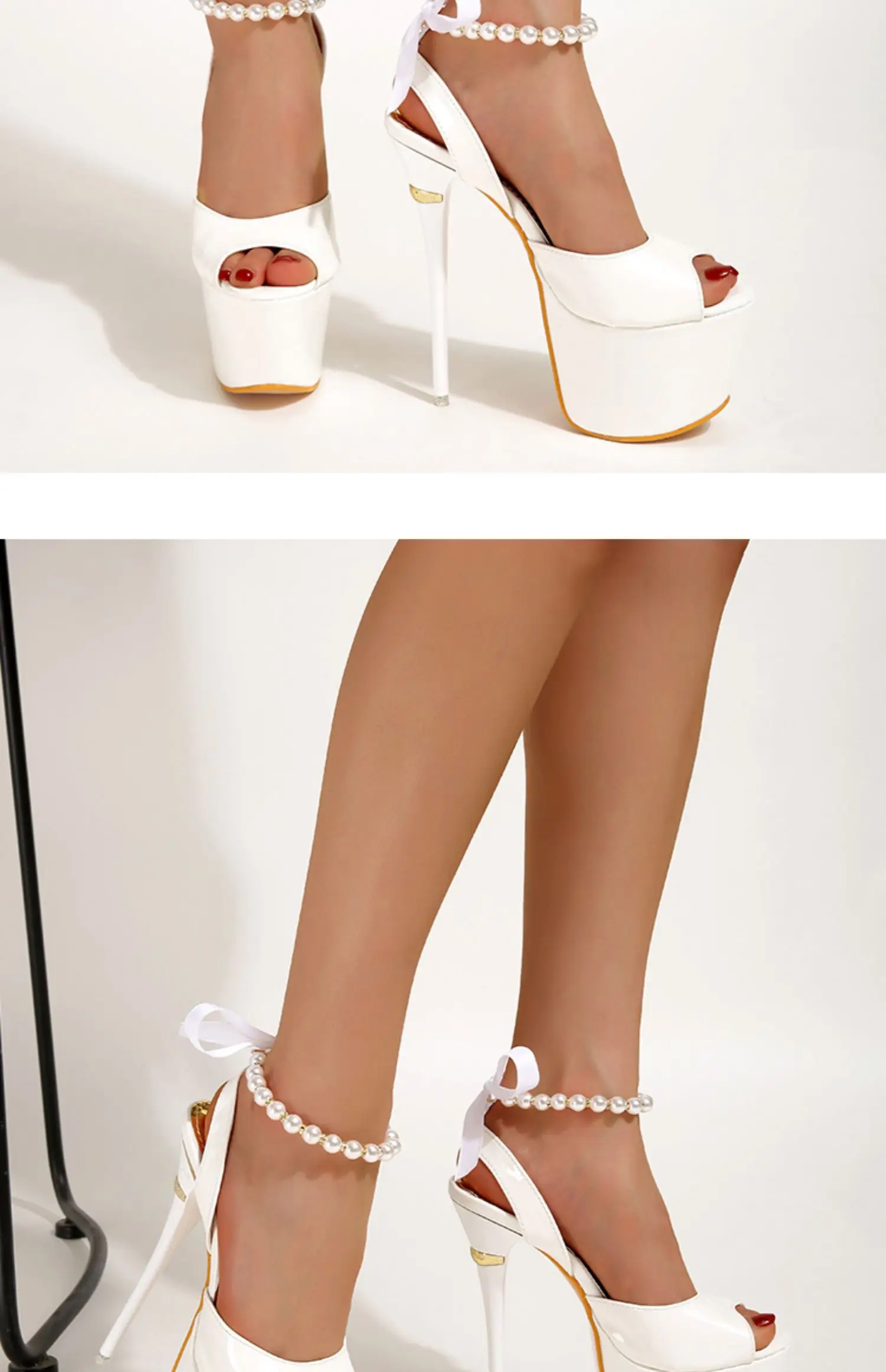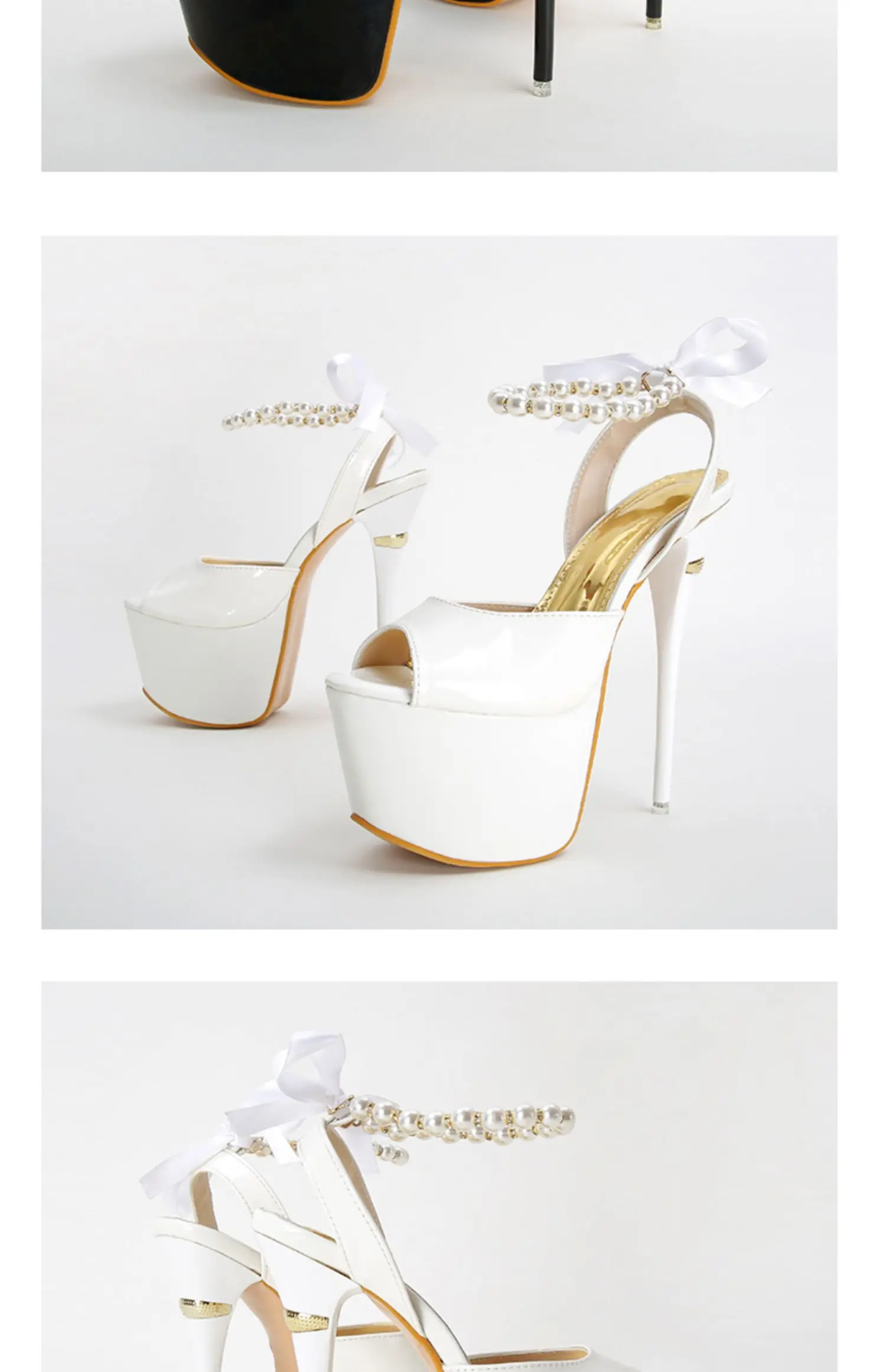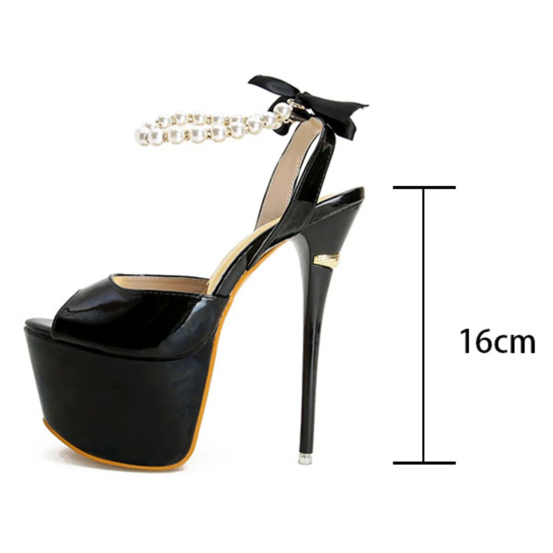 2023 Summer shallow patent leather back empty thin heel fish mouth pearl buckle ultra-high heel female sandals