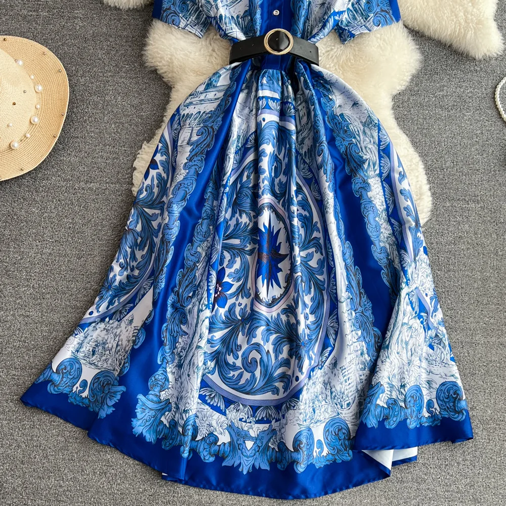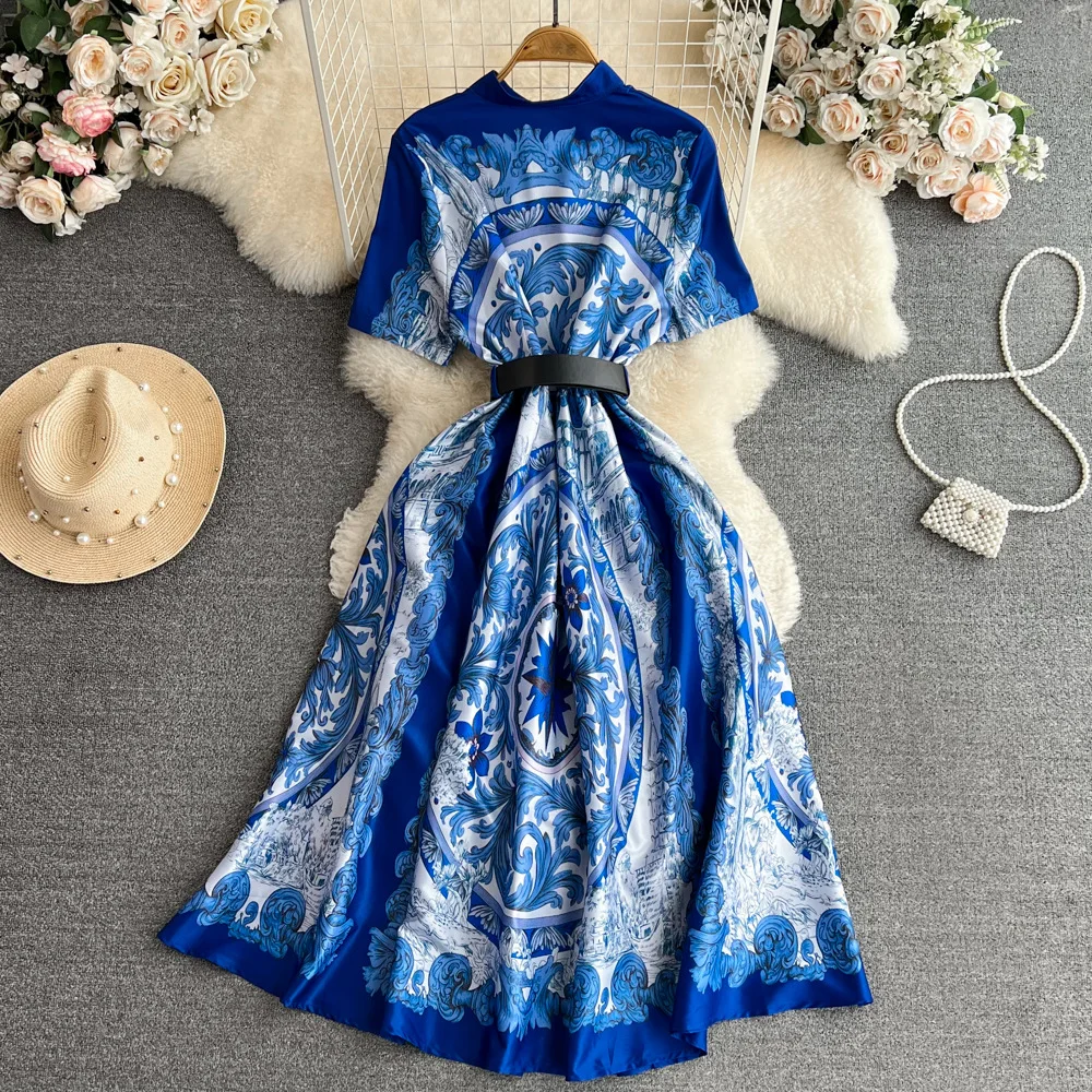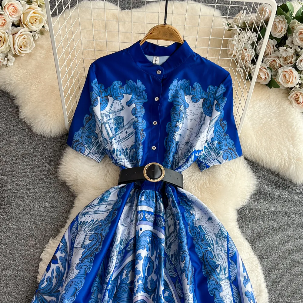 2023 Summer Vintage Style Short Sleeve Printed A-Line Shirt Dress