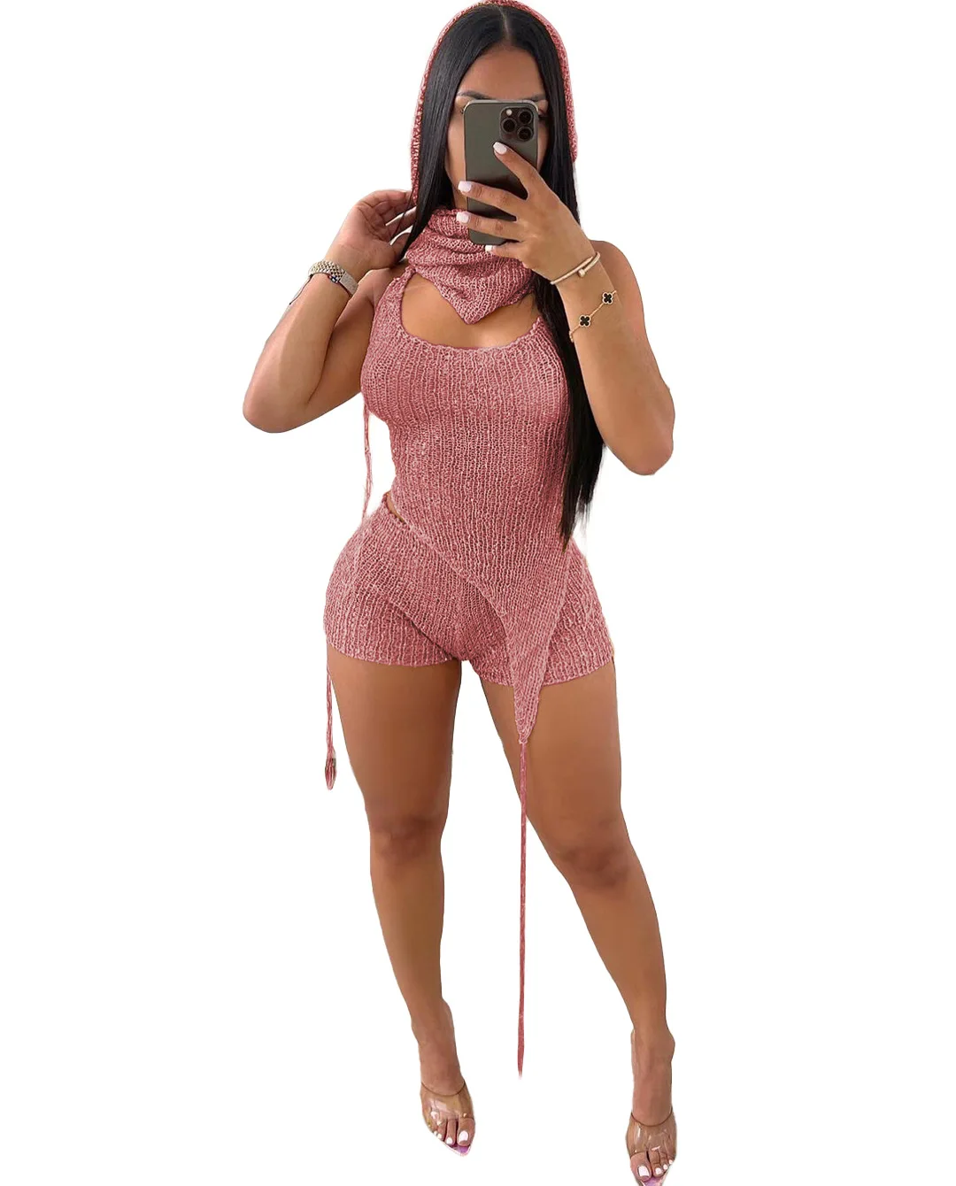 2023 Summer Women Clothing Hooded 2 Piece Shorts Set Crop Top Backless Hollow out Two Piece Short Set for Ladies