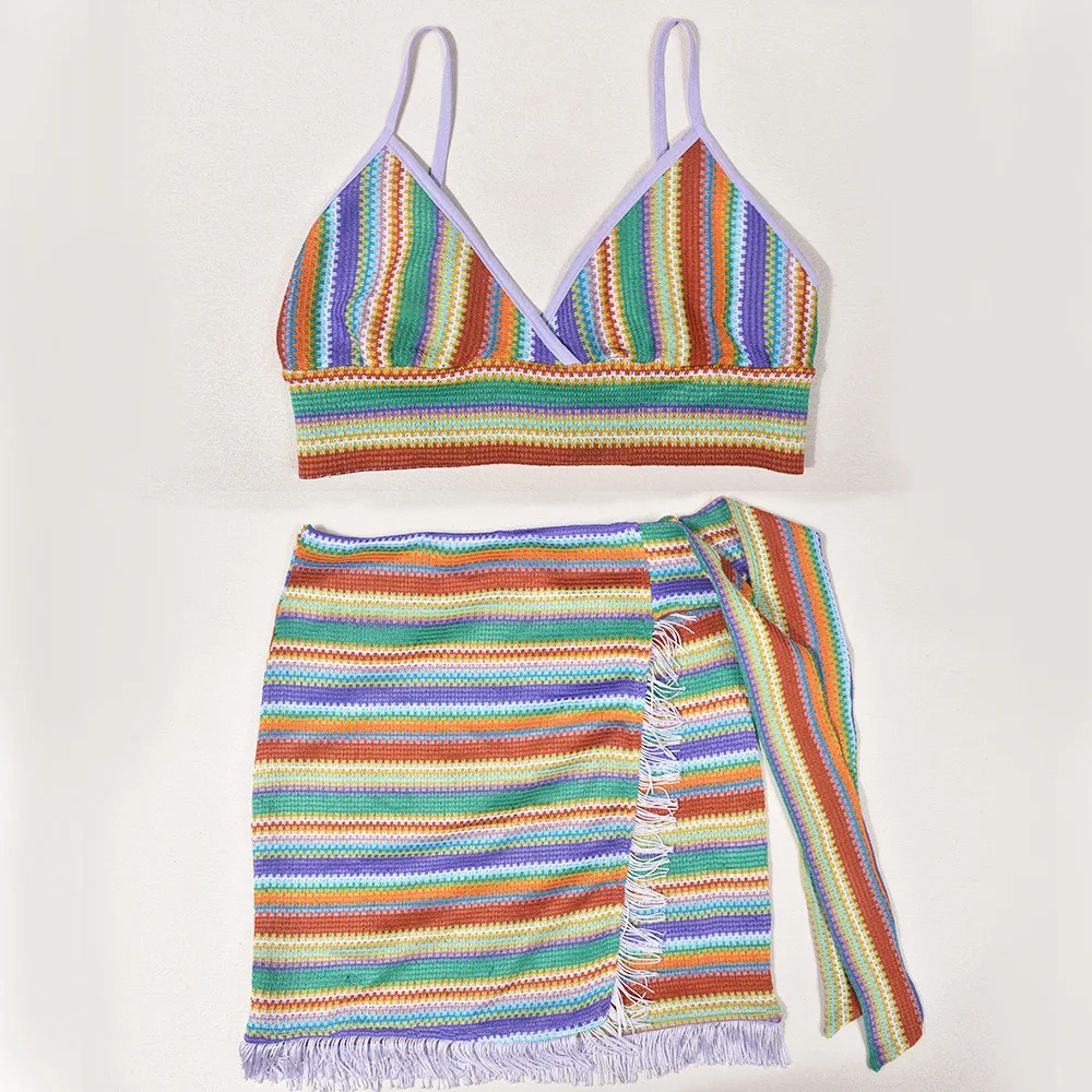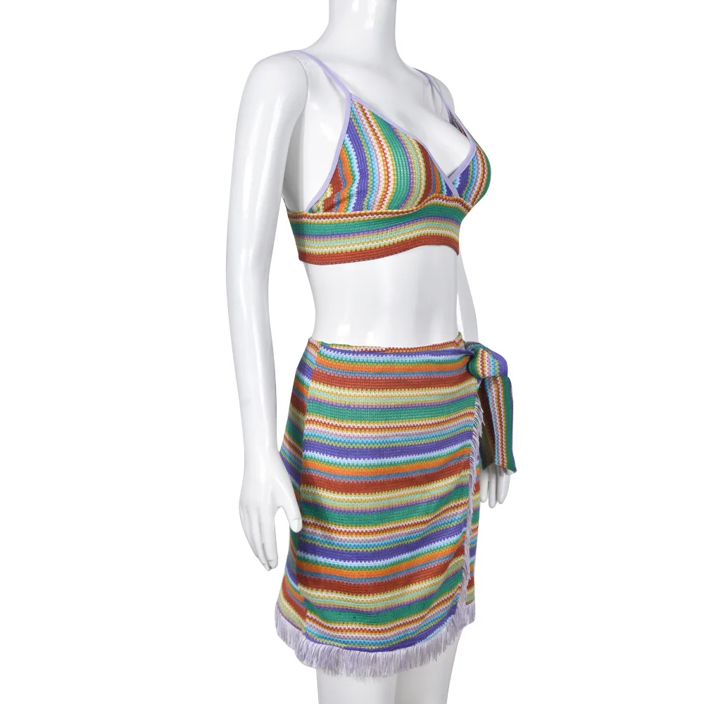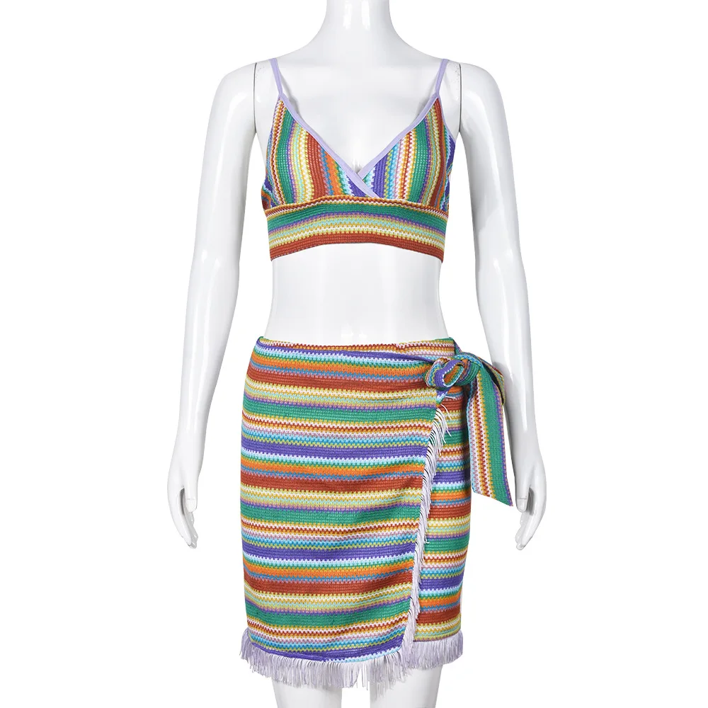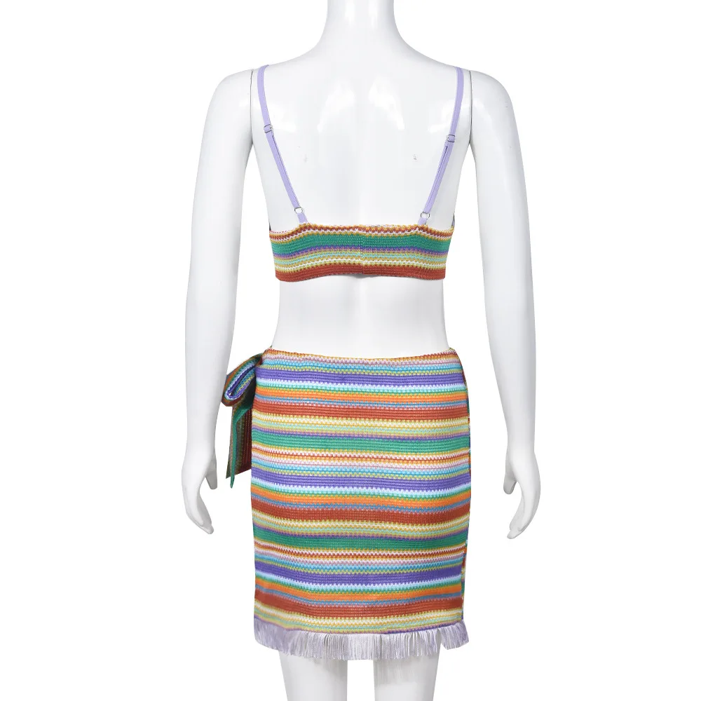 2023 Wholesale Women Clothing 2 Piece Halter Backless Top Tassel Wrap Skirt Set Women Sexy Party Wear Women Knitted Skirt Set