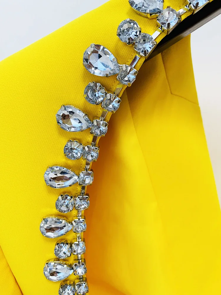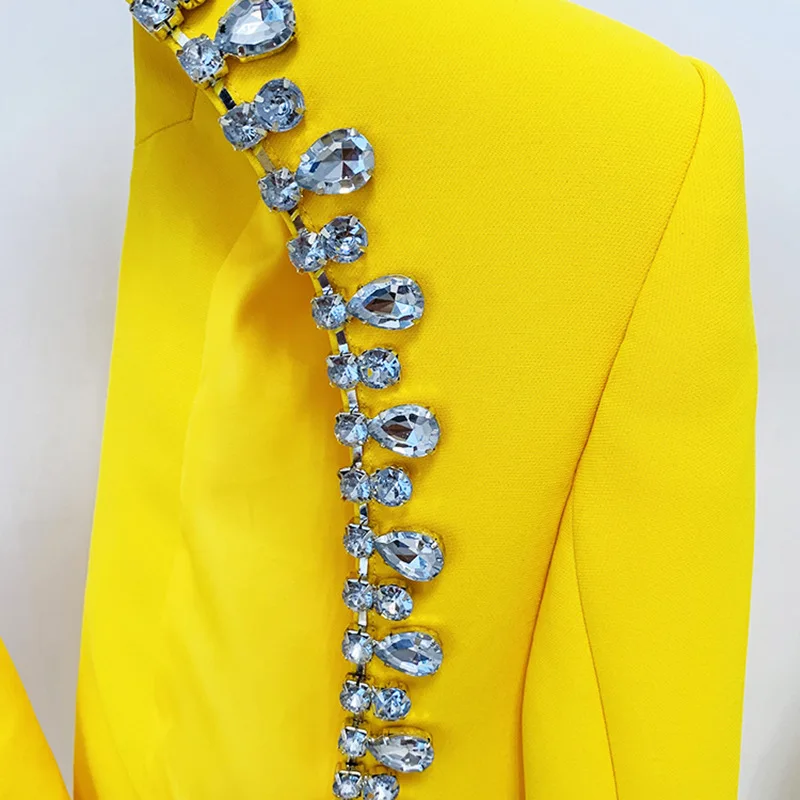 The standout feature of this jacket is its intricately designed hollow back, embellished with jewelry-grade rhinestones for a luxurious and extravagant look.