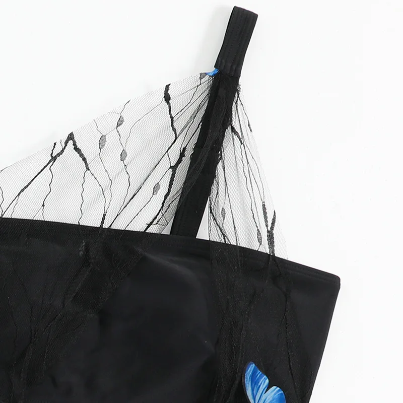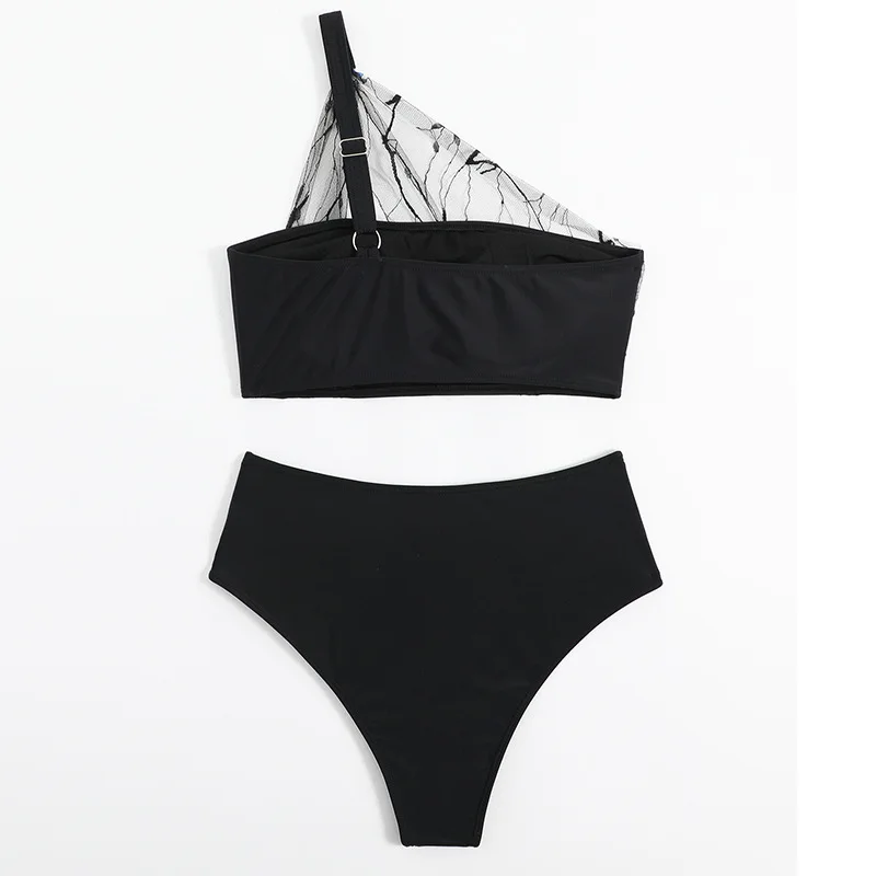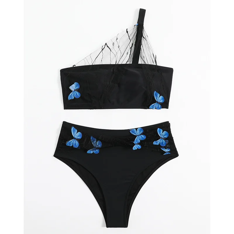 2023 Women's 2 Piece Push Up High Waisted Butterfly Swimsuit One Shoulder Swimwear Black Lace High Slit Bathing Suit Two Piece