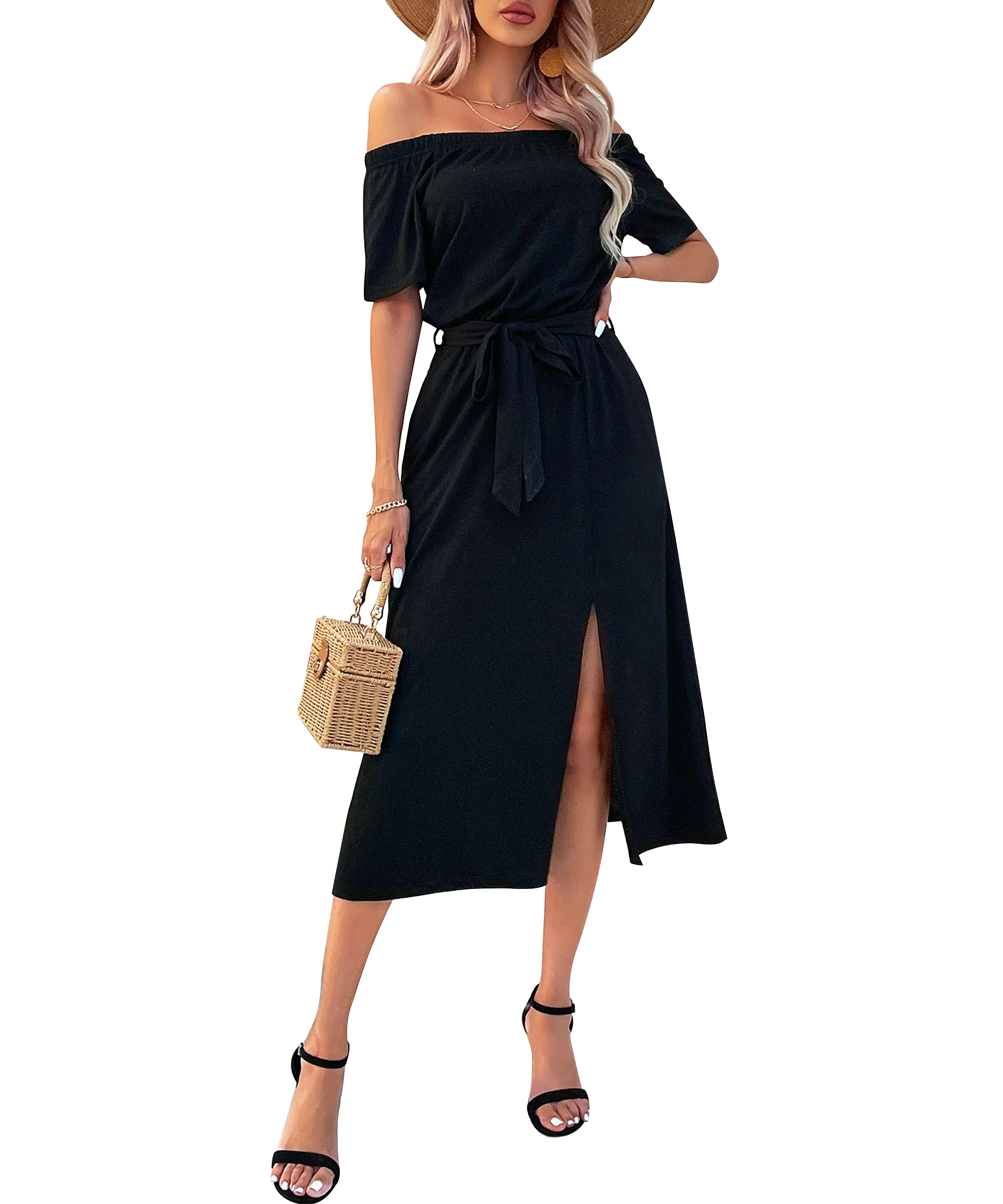 2023 women's new summer dress off-shoulder short sleeve lace-up waist slit mid-length dress