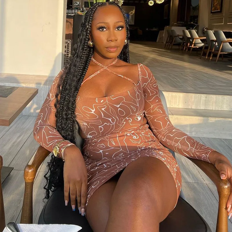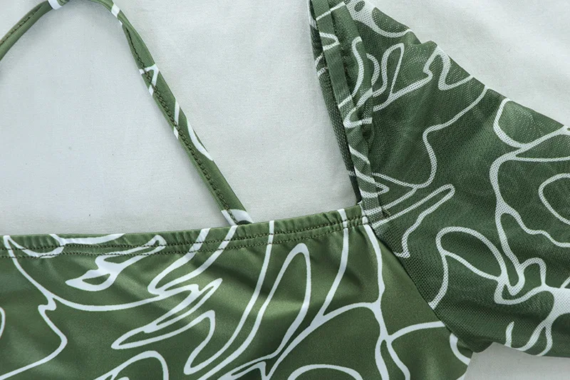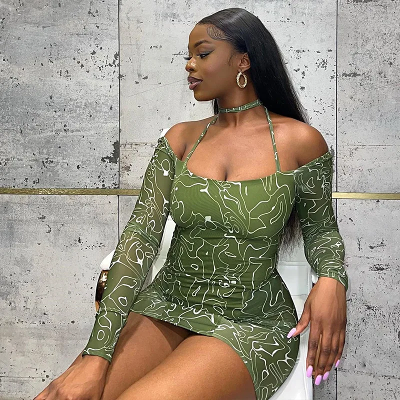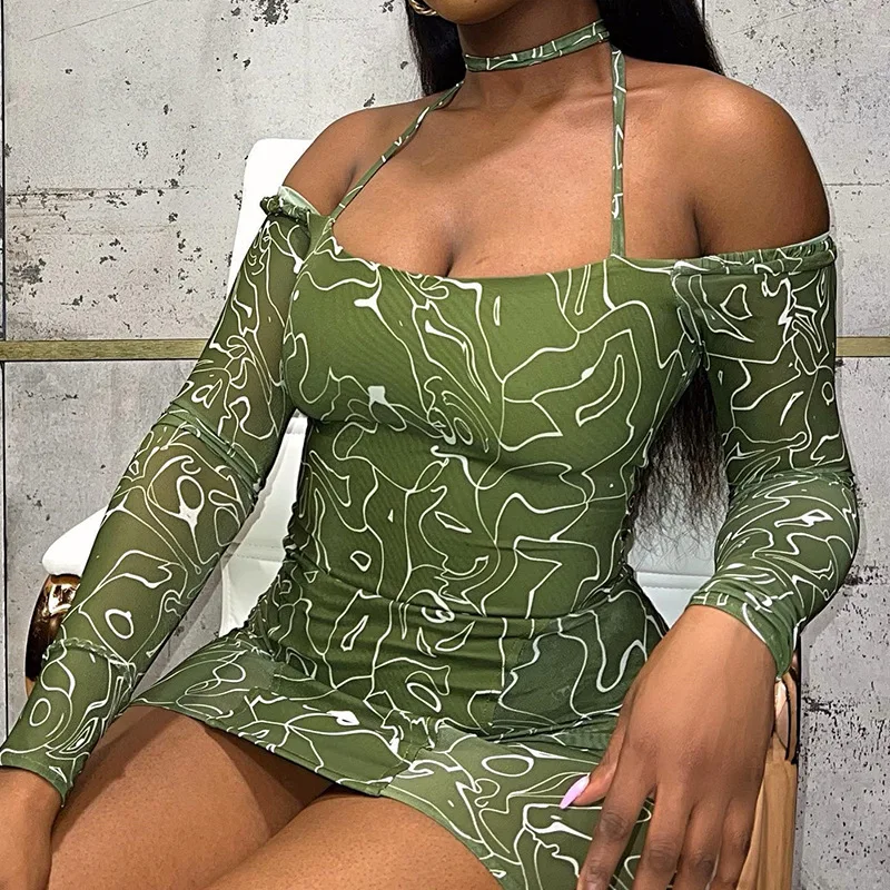 2023 Women's Wear Autumn and Winter New Fashion Printing Mesh Splice Wrapped Chest and Neck Dress Wholesale