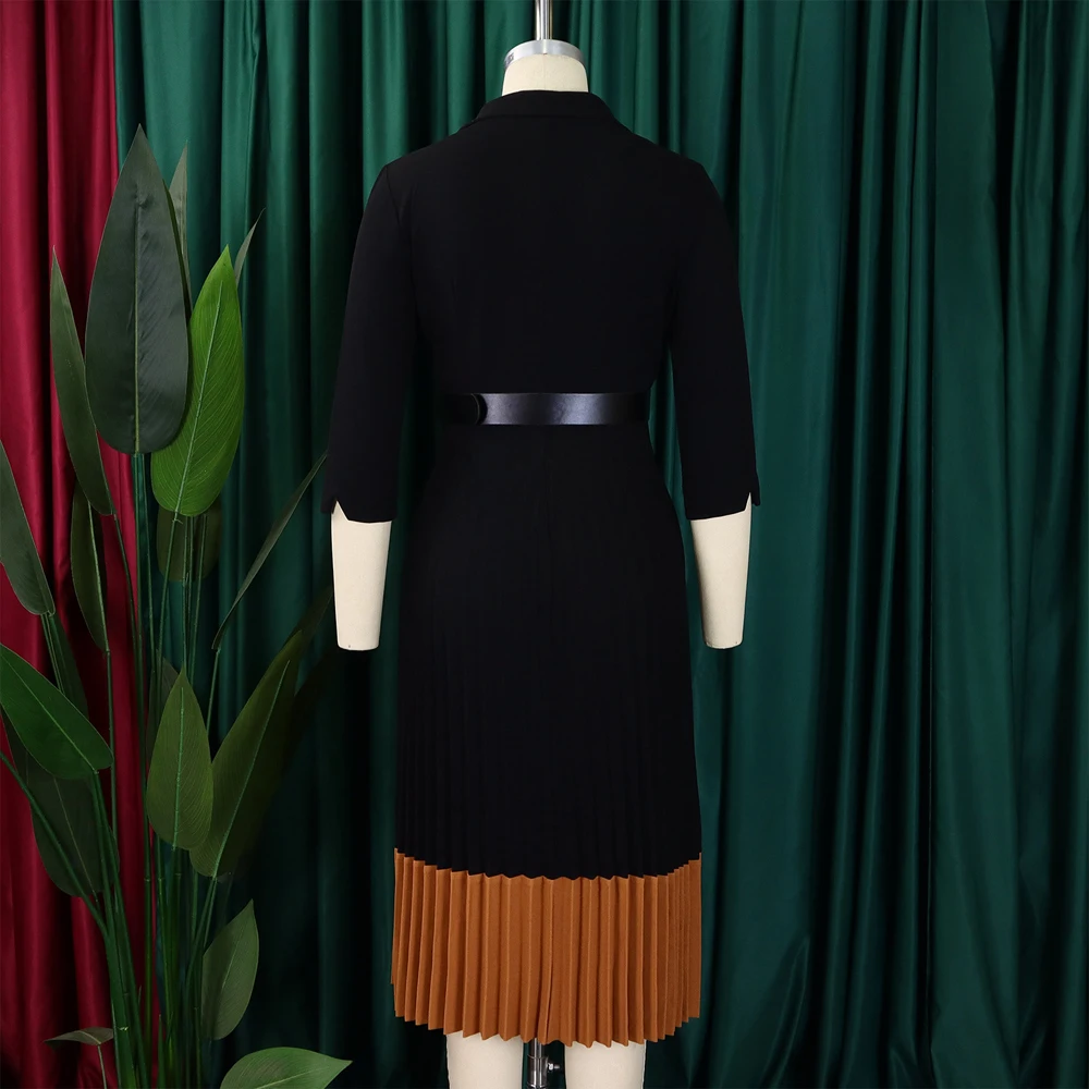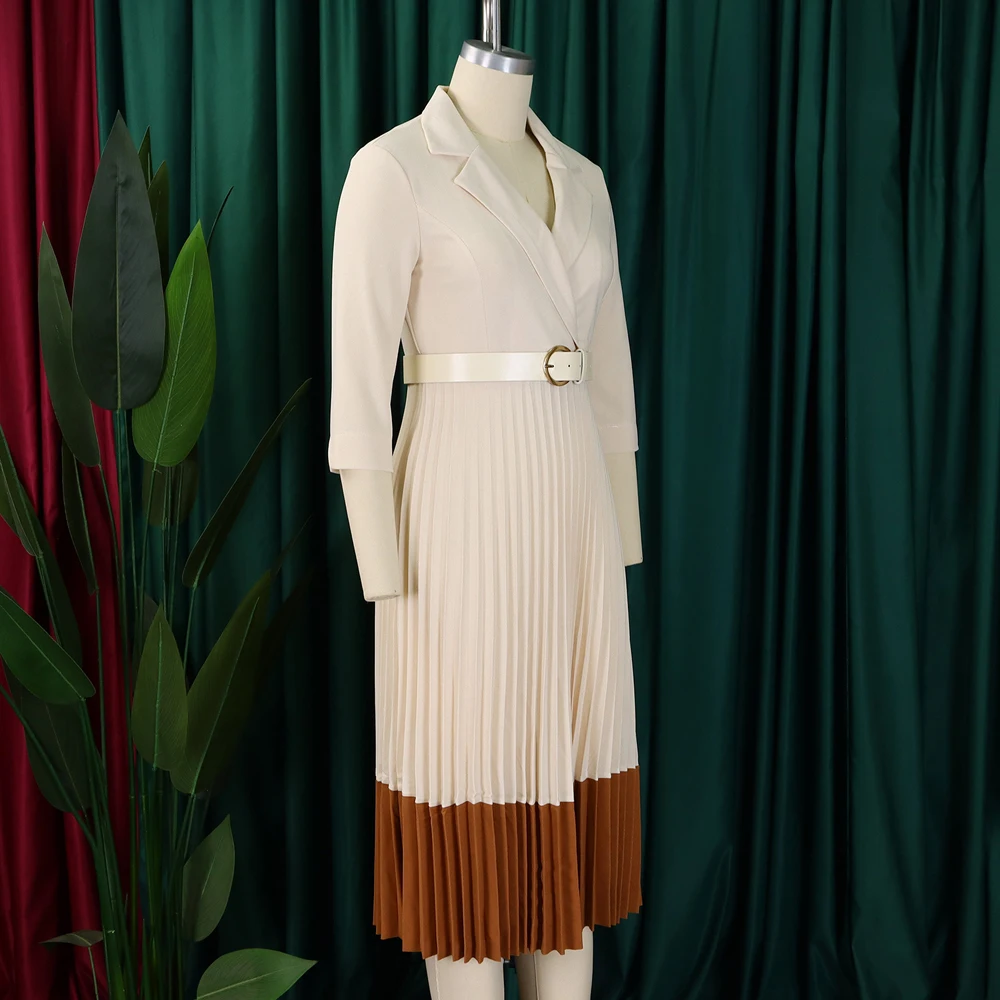 2024 Autumn Fashion Women Elegant Pleated Dress Suit Collar Long Sleeve Belt African Dresses Office Lady Pleat Church Dress