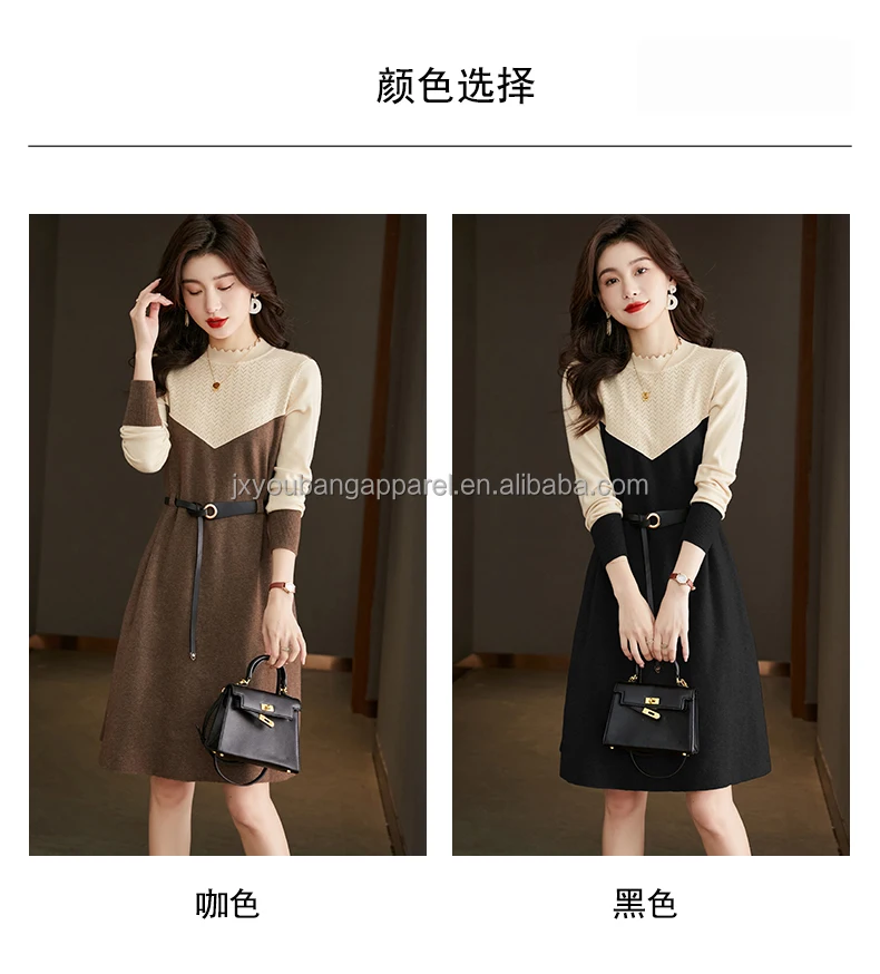 2024 Autumn new arrival women solid color crew neck belted waist knitted dress
