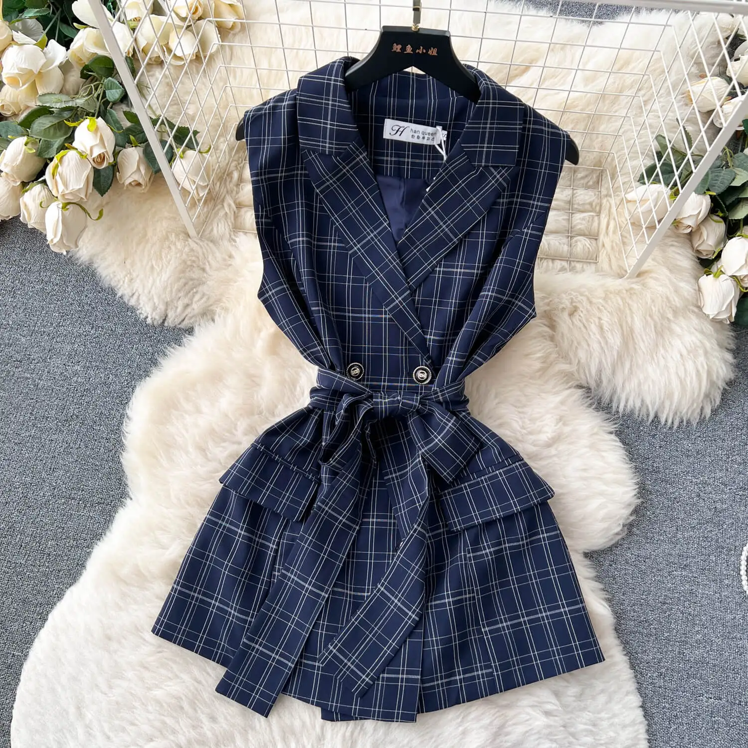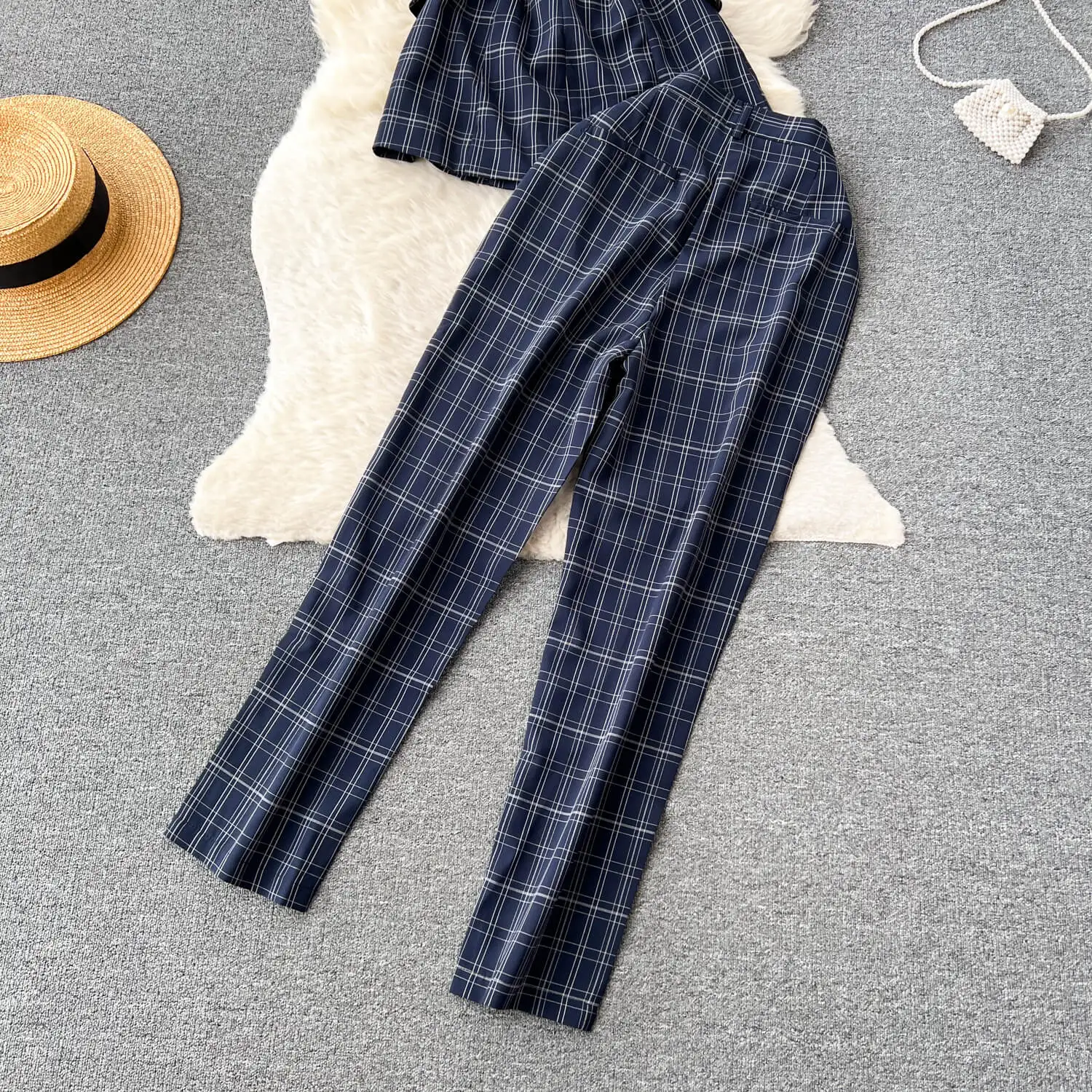 2024 Double Breasted Plaid Lace Up Top Blazer Suits Set For Women For Office