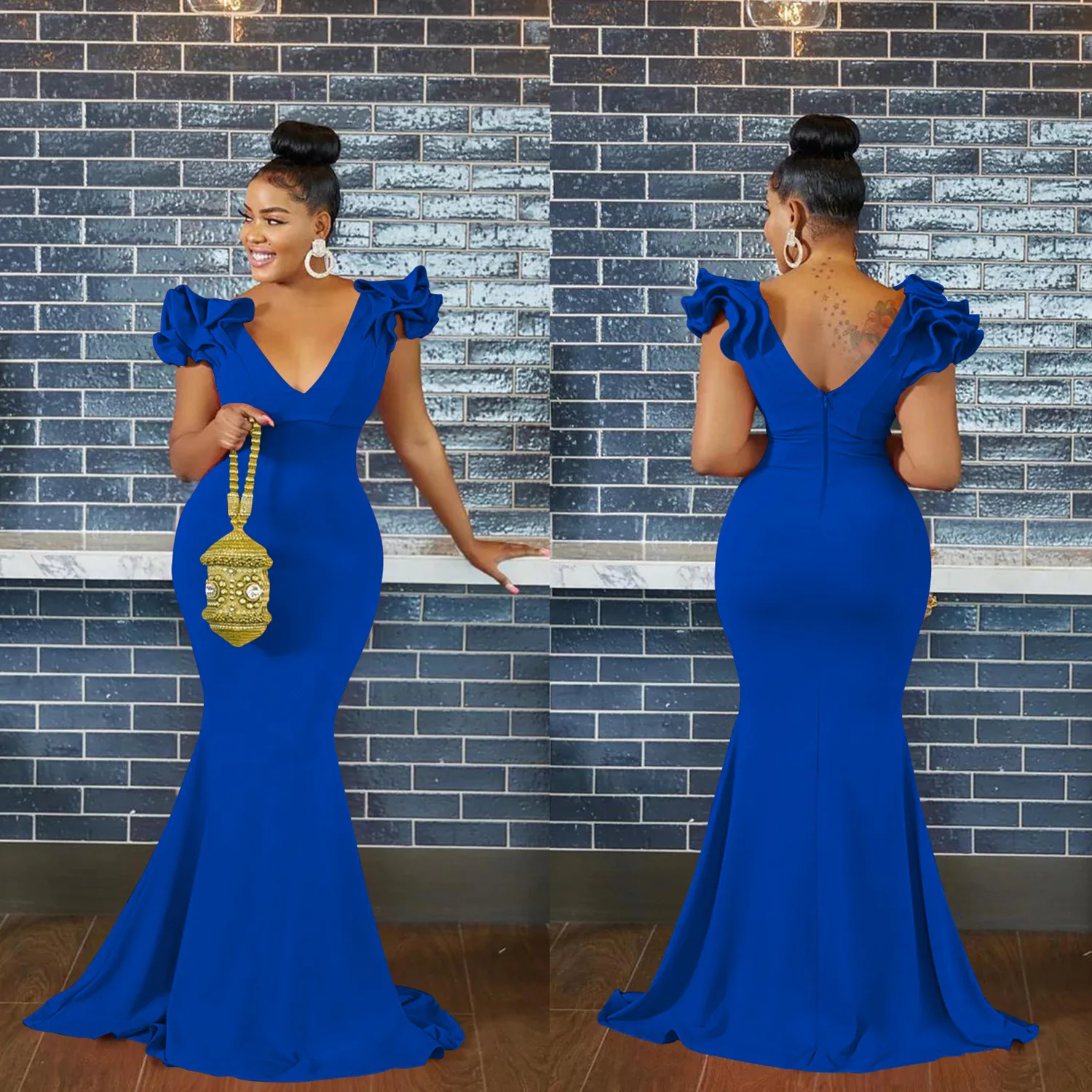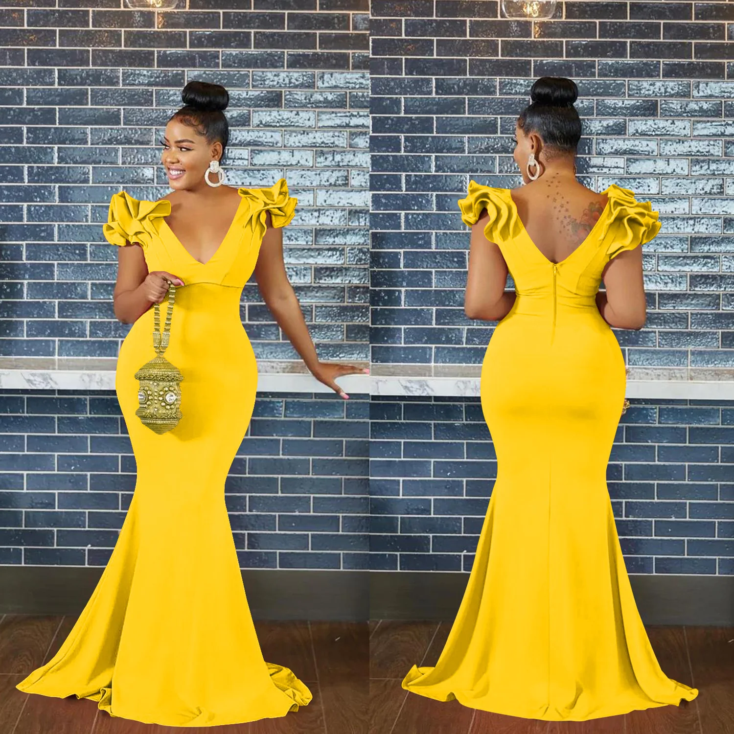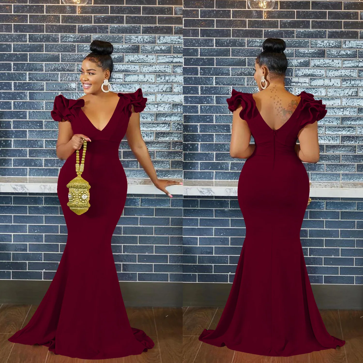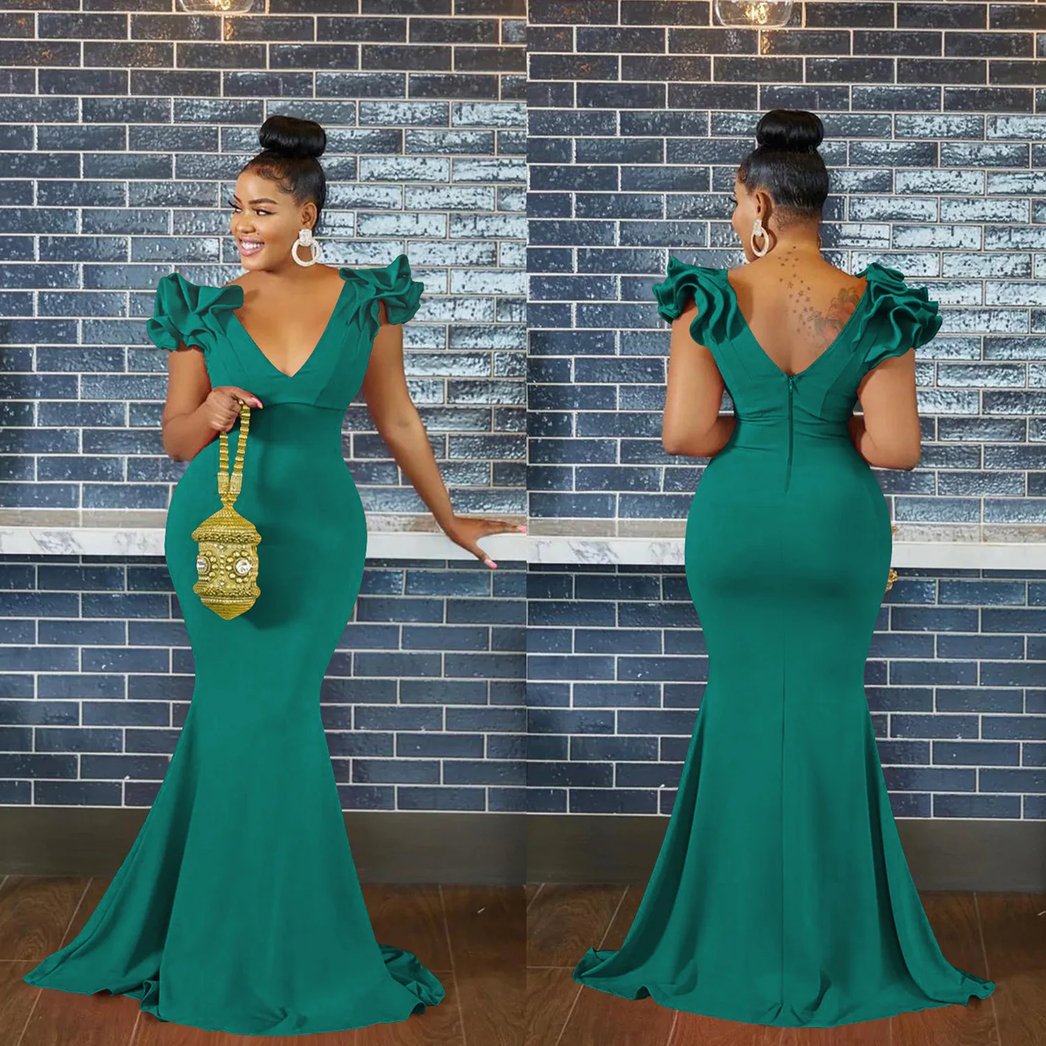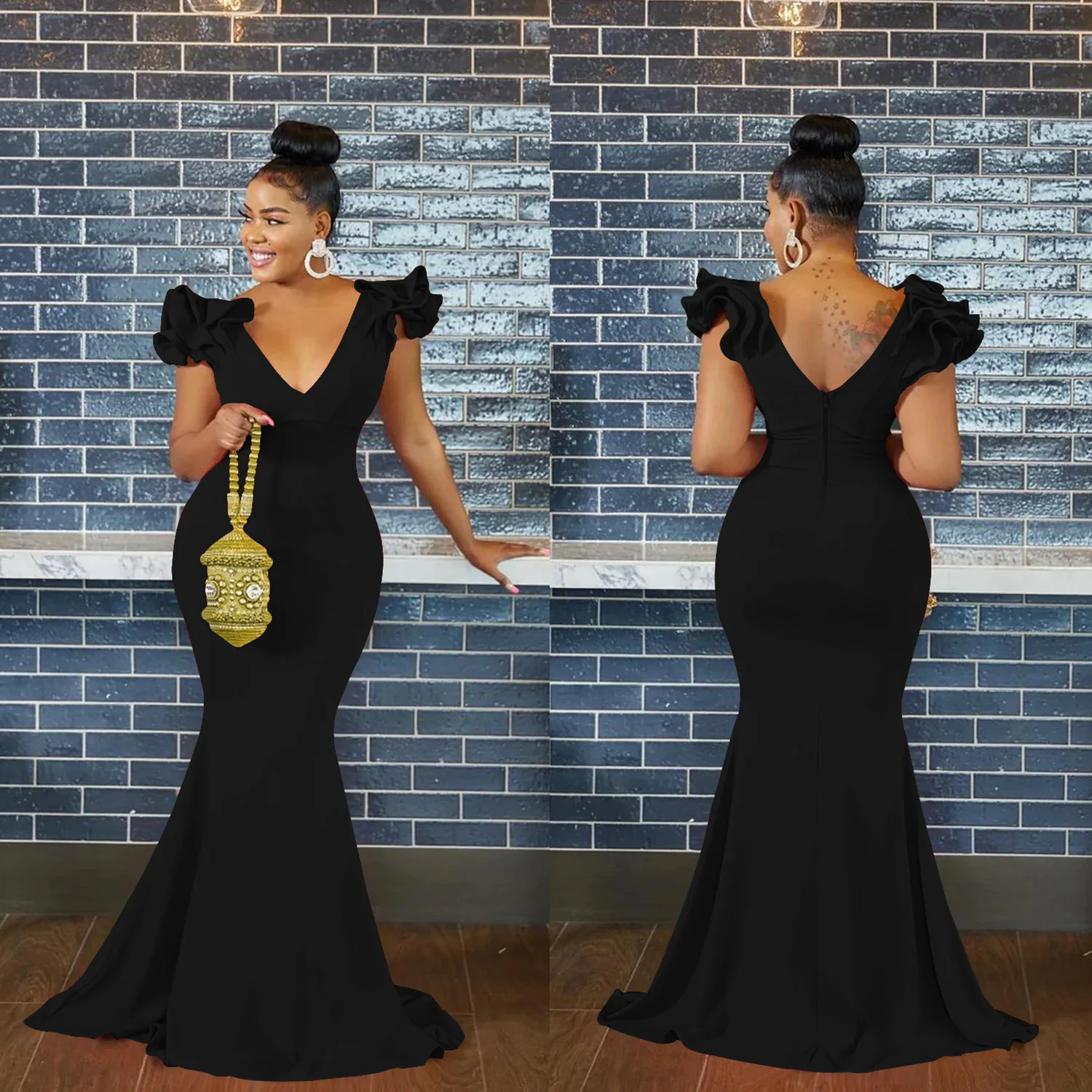 2024 Europe Women Summer Solid Color V-Neck Ruffles Sleeveless Long Slim Dresses Fashion Lady Casual Dress Evening Party Dress