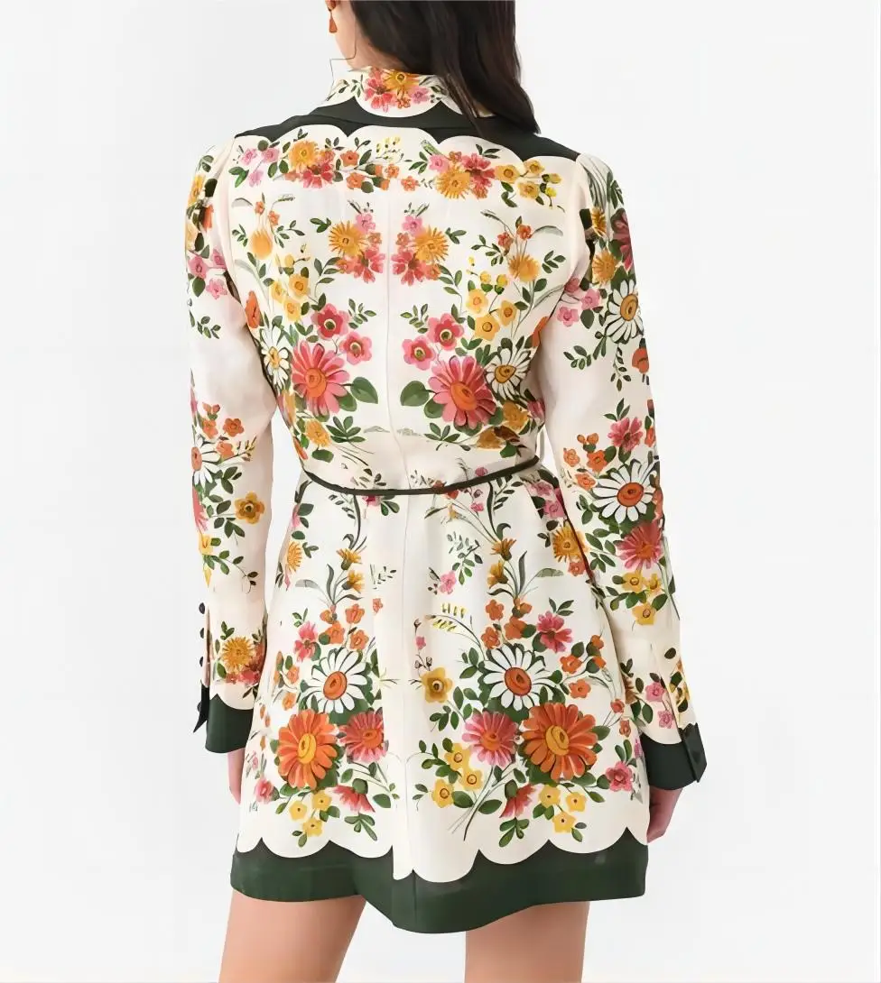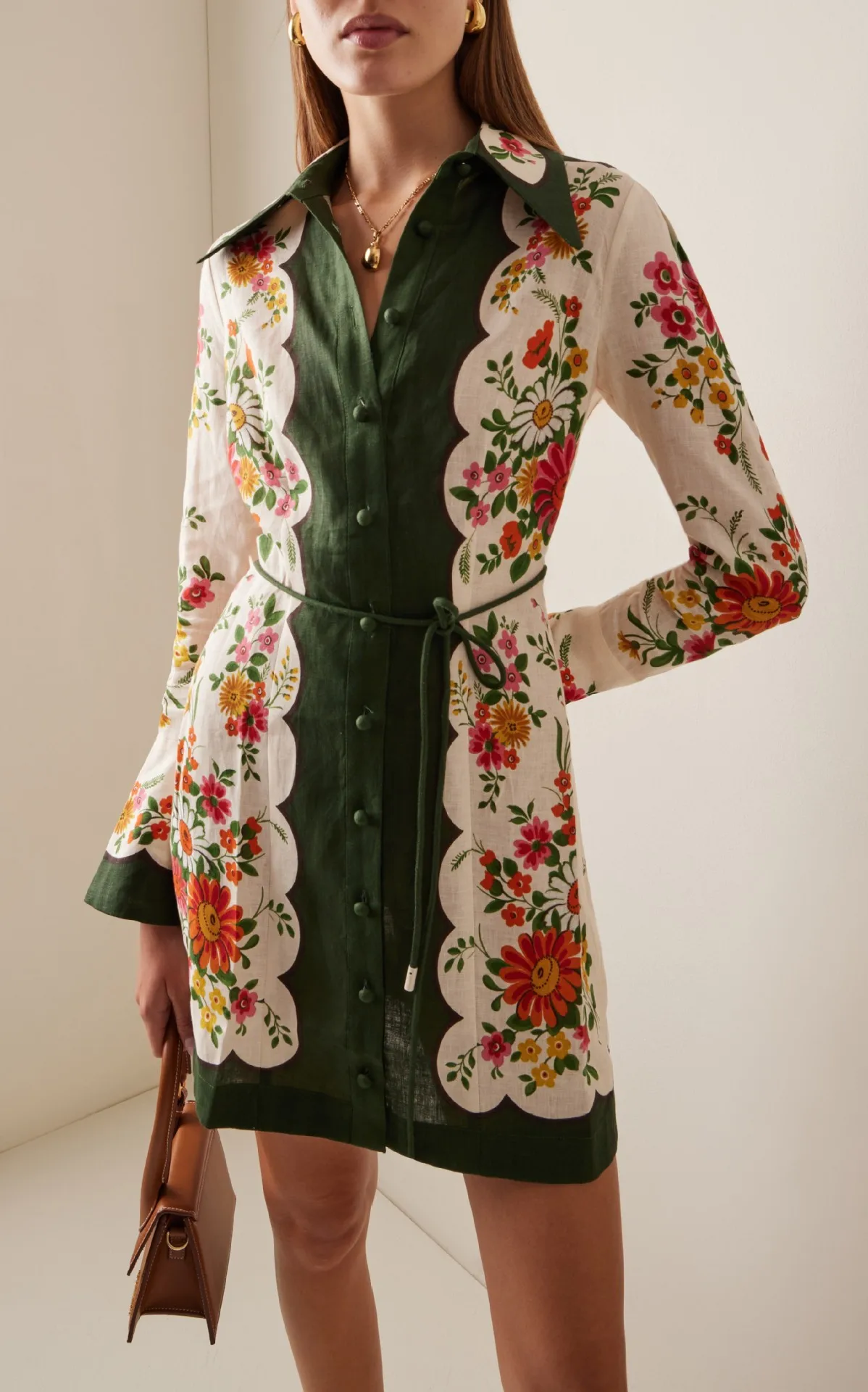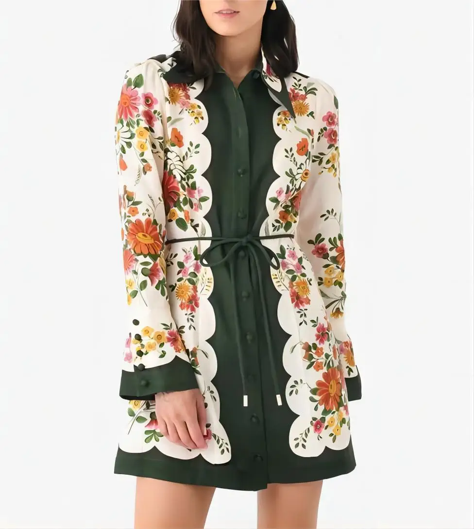 2024 European and American Spring and Summer new linen Long sleeve Plant Printing lace-up Lapel Women's dress