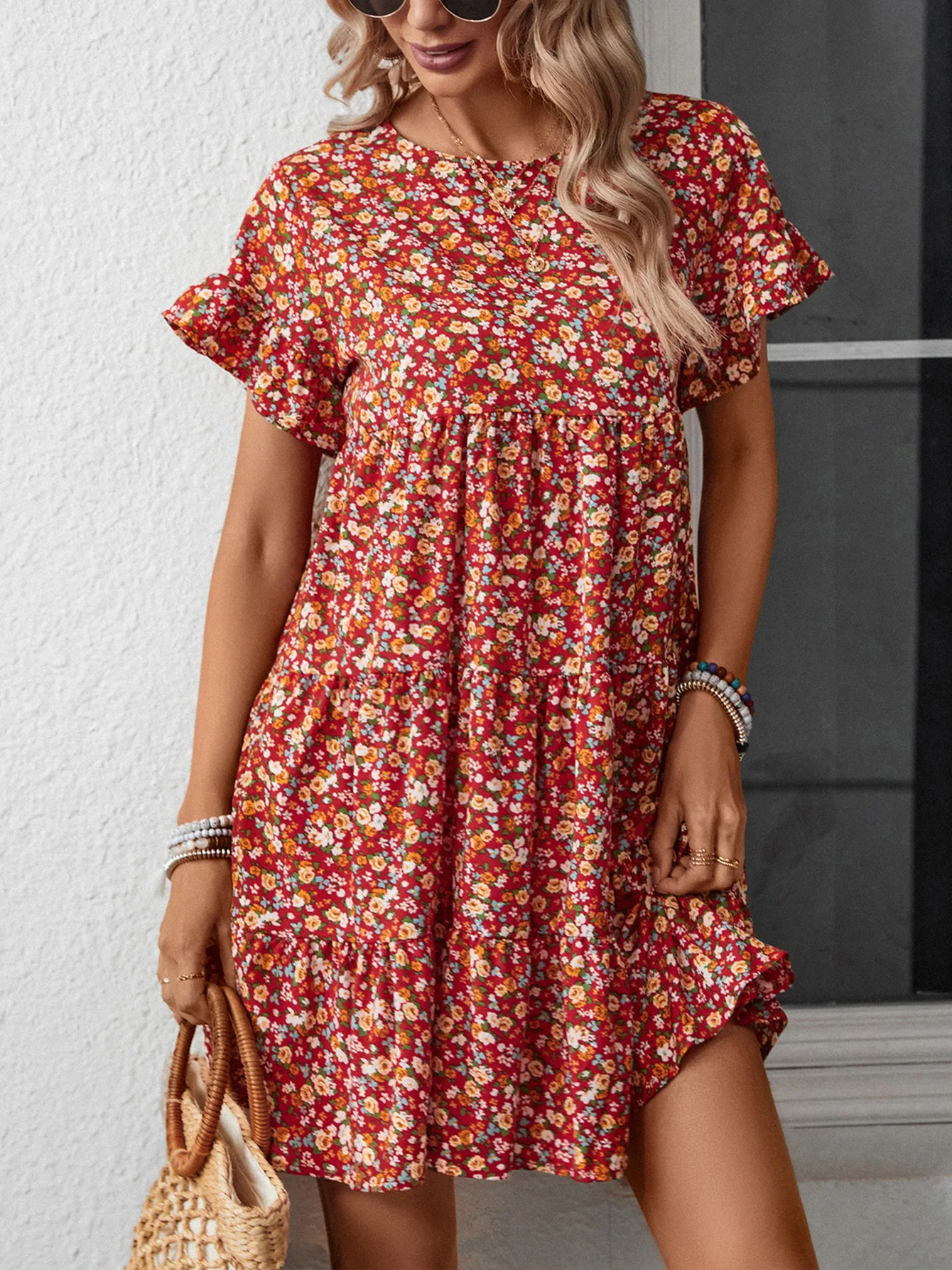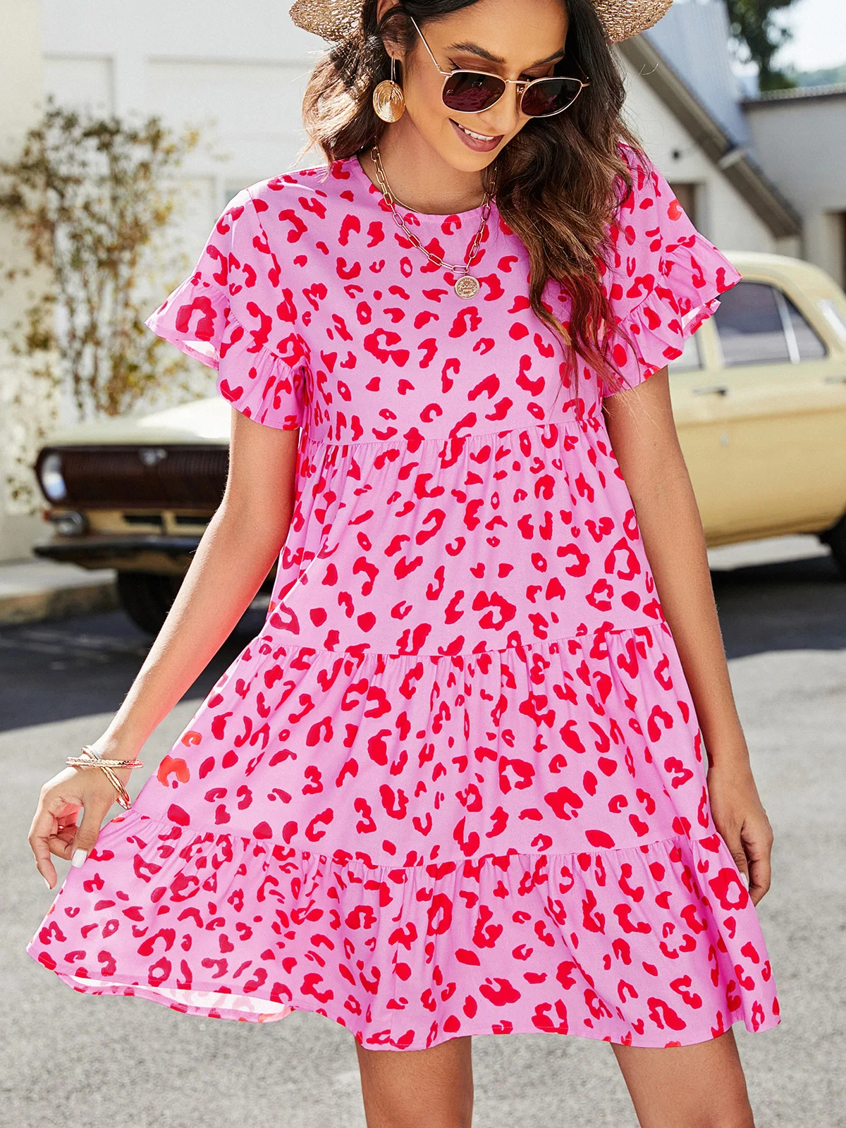 2024 European and American summer new leopard print floral crew-neck casual loose women's dress