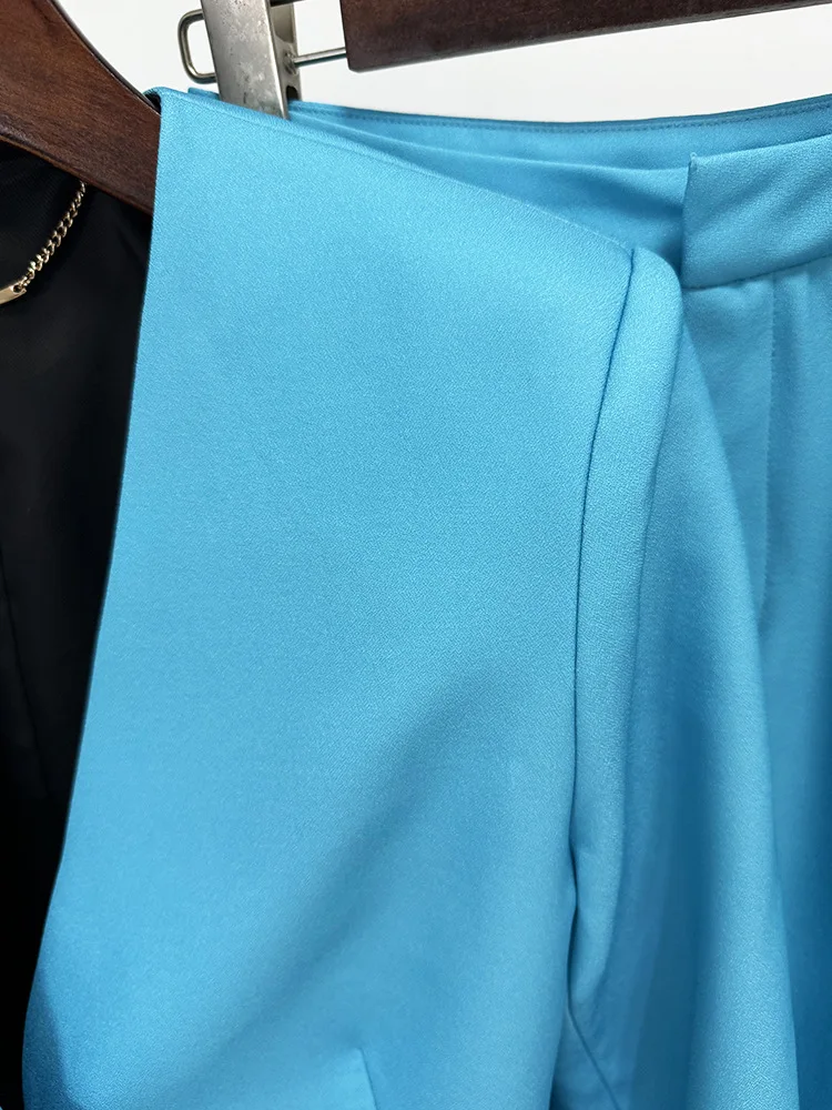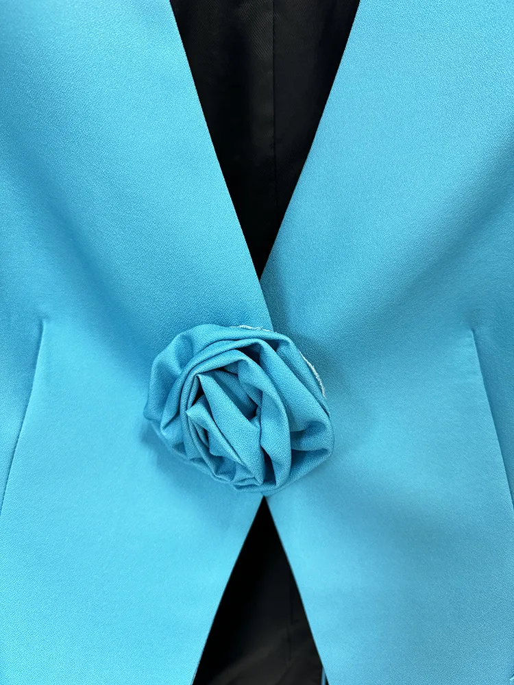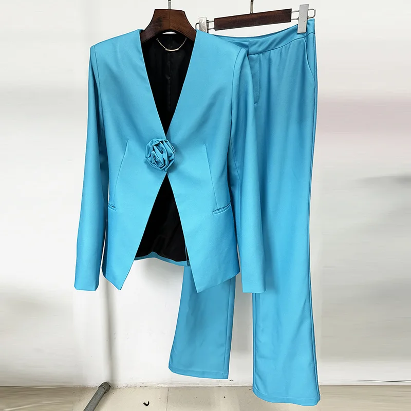 2024 European New Designed Lady Office Suit Sexy V-neckline Long Sleeve Solid Flower Blazer Flared Pants Women 2Pcs